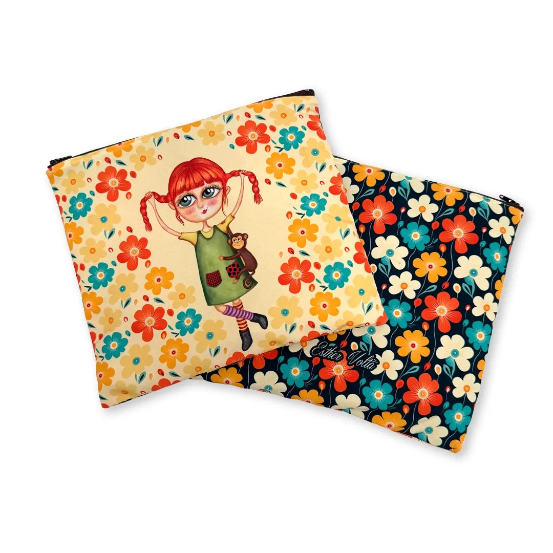 Bolsa de tejido hidrófugo ilustrada por Esther Voltà. Cierre Cremallera. Con forro de plástico ecológico para mayor impermeabilidad