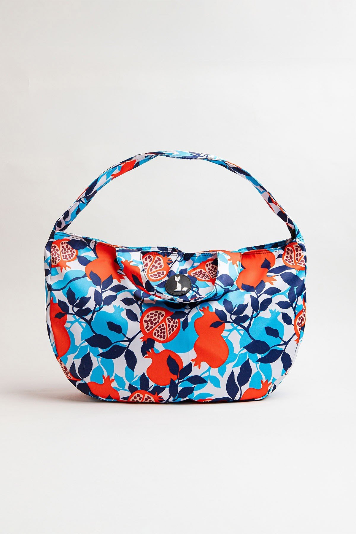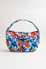 Bolso de hombro con silueta redondeada y asa ancha integrada. Detalle de solapa frontal con cierre y parche circular con logo.