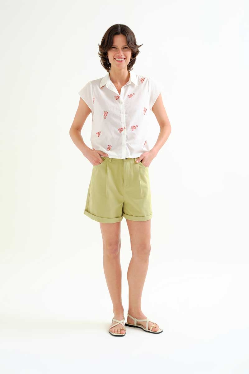 Camisa con tejido 100% algodón de color blanco. Cuello solapa y manga corta. Cierre frontal con botones de color blanco. Detalle de flores bordadas. La modelo mide 177 cm y lleva la talla S.