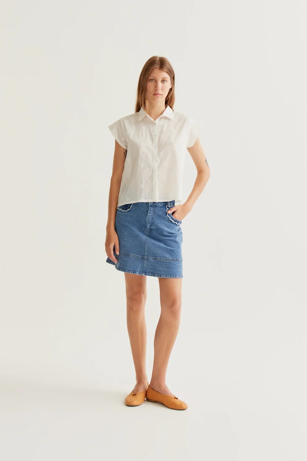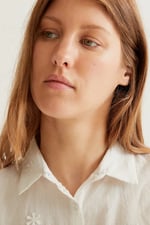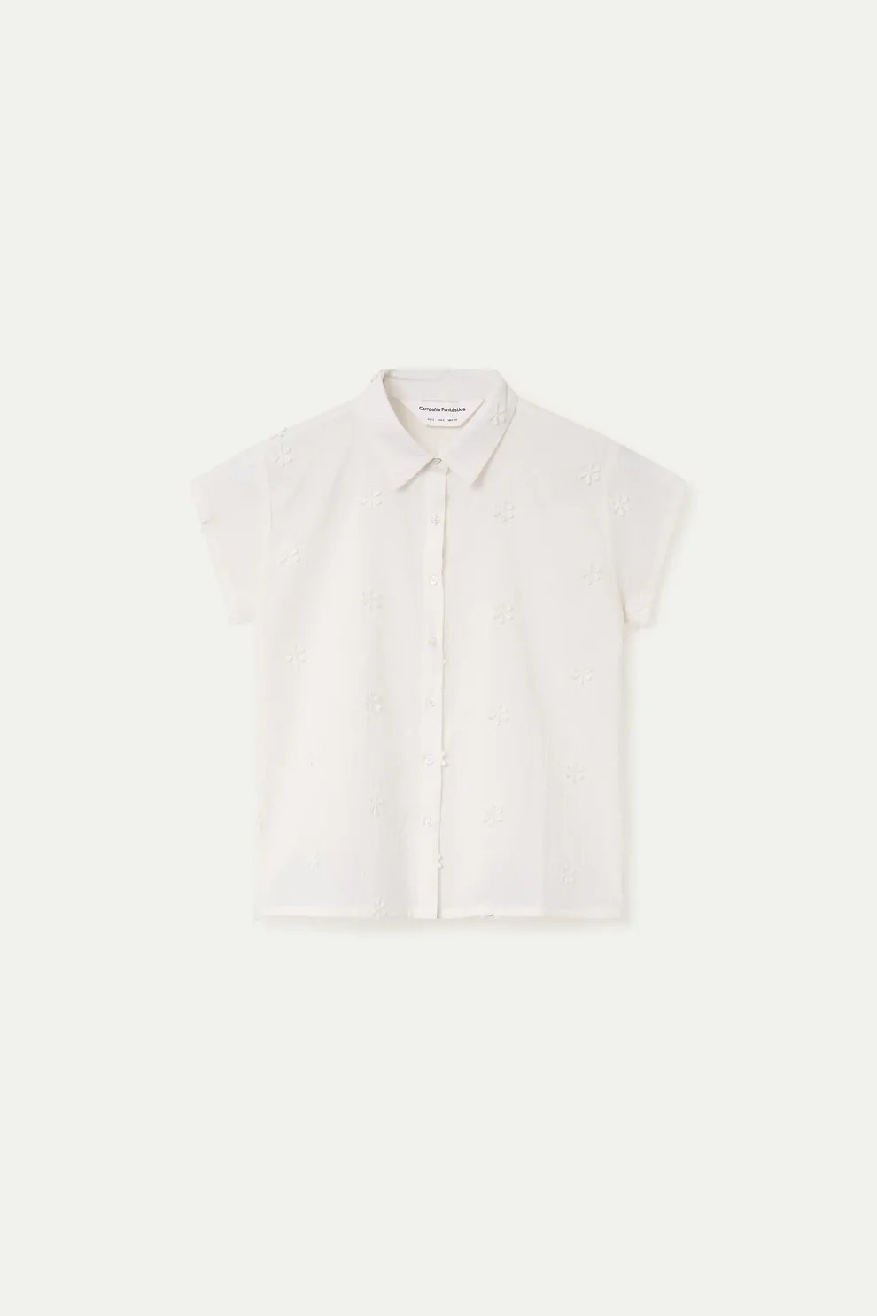 Camisa con tejido 100% algodón de color blanco. Cuello solapa y manga corta. Cierre frontal con botones de color blanco. Detalle de flores bordadas. La modelo mide 177 cm y lleva la talla S.