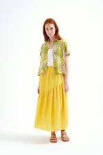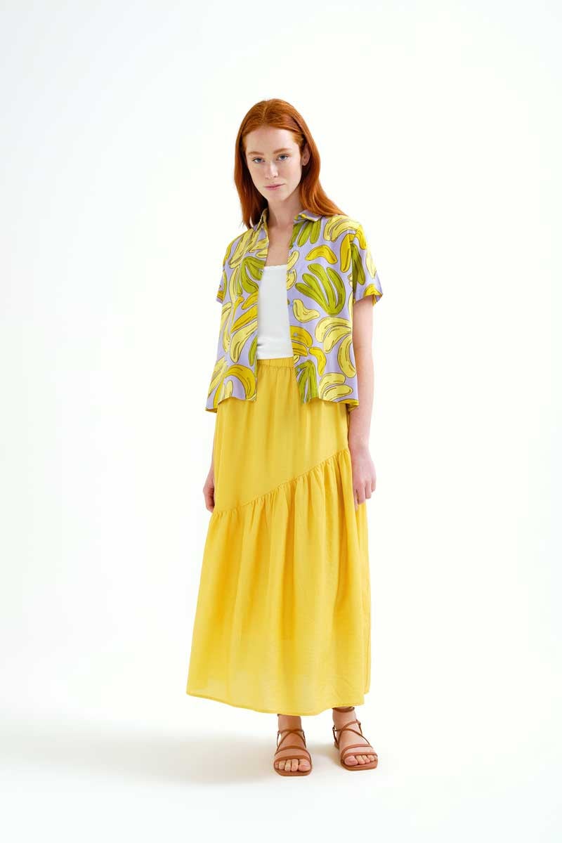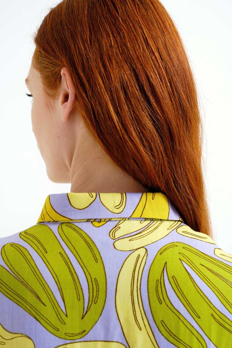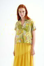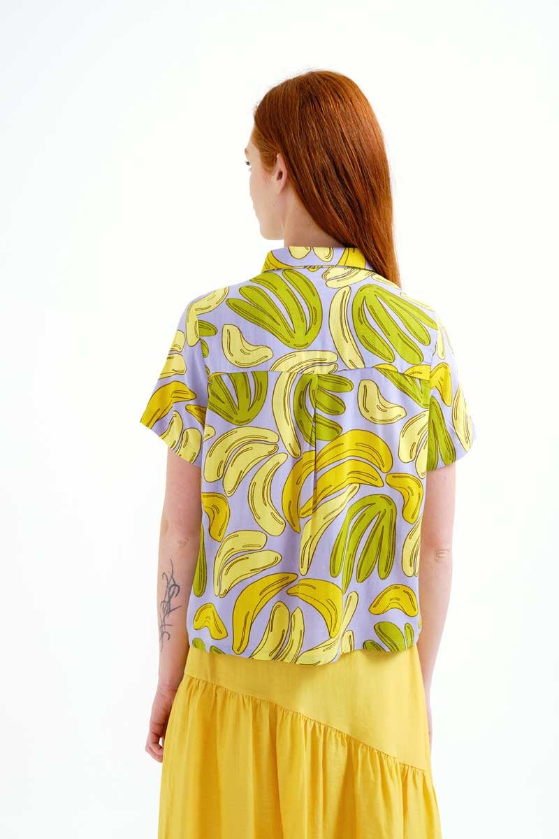 Camisa con tejido estampado guineo. Cuello solapa y manga corta. Cierre frontal con botones de color amarillo. La modelo mide 175 cm y lleva la talla S.