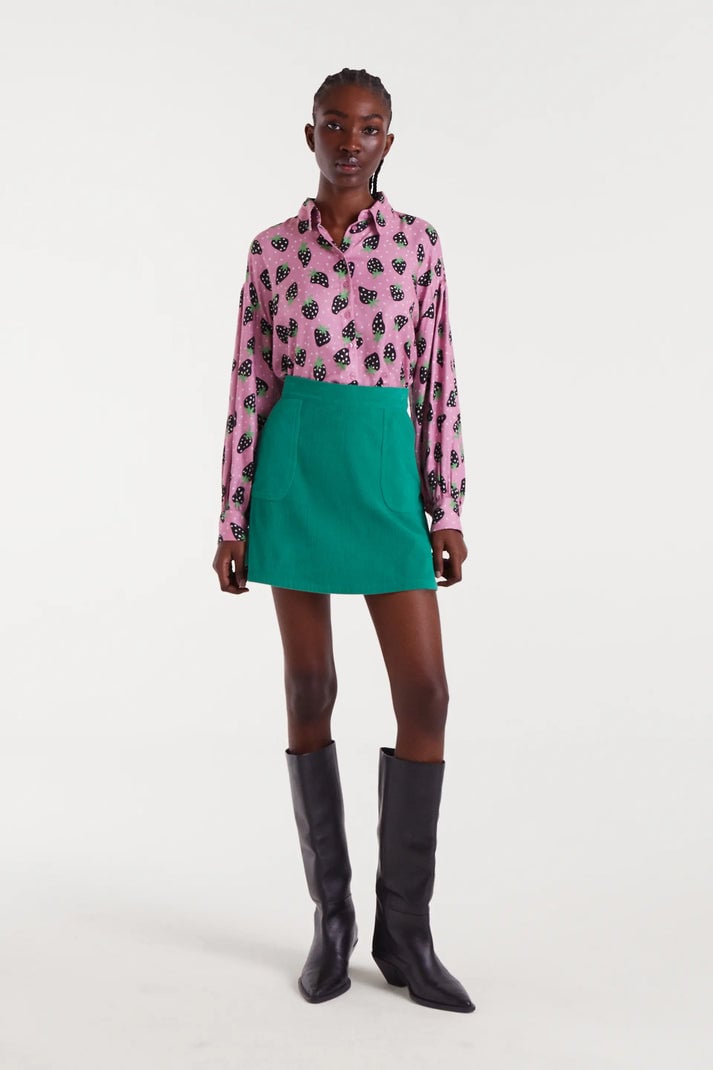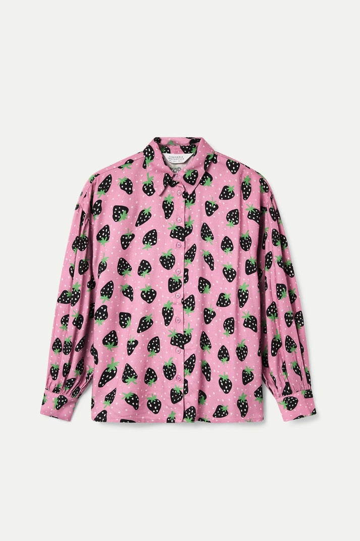 Camisa con estampado Morango Small. Cuello con solapa y manga larga terminada en puño con botón. Cierre frontal con botón. La modelo mide 177 cm y lleva la talla S.