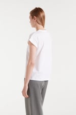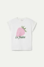 Camiseta con tejido 100% algodón de color blanco roto con estampado maxi Le fraise. Con cuello redondo y manga corta con vuelta. La modelo mide 179 cm y lleva la talla S.