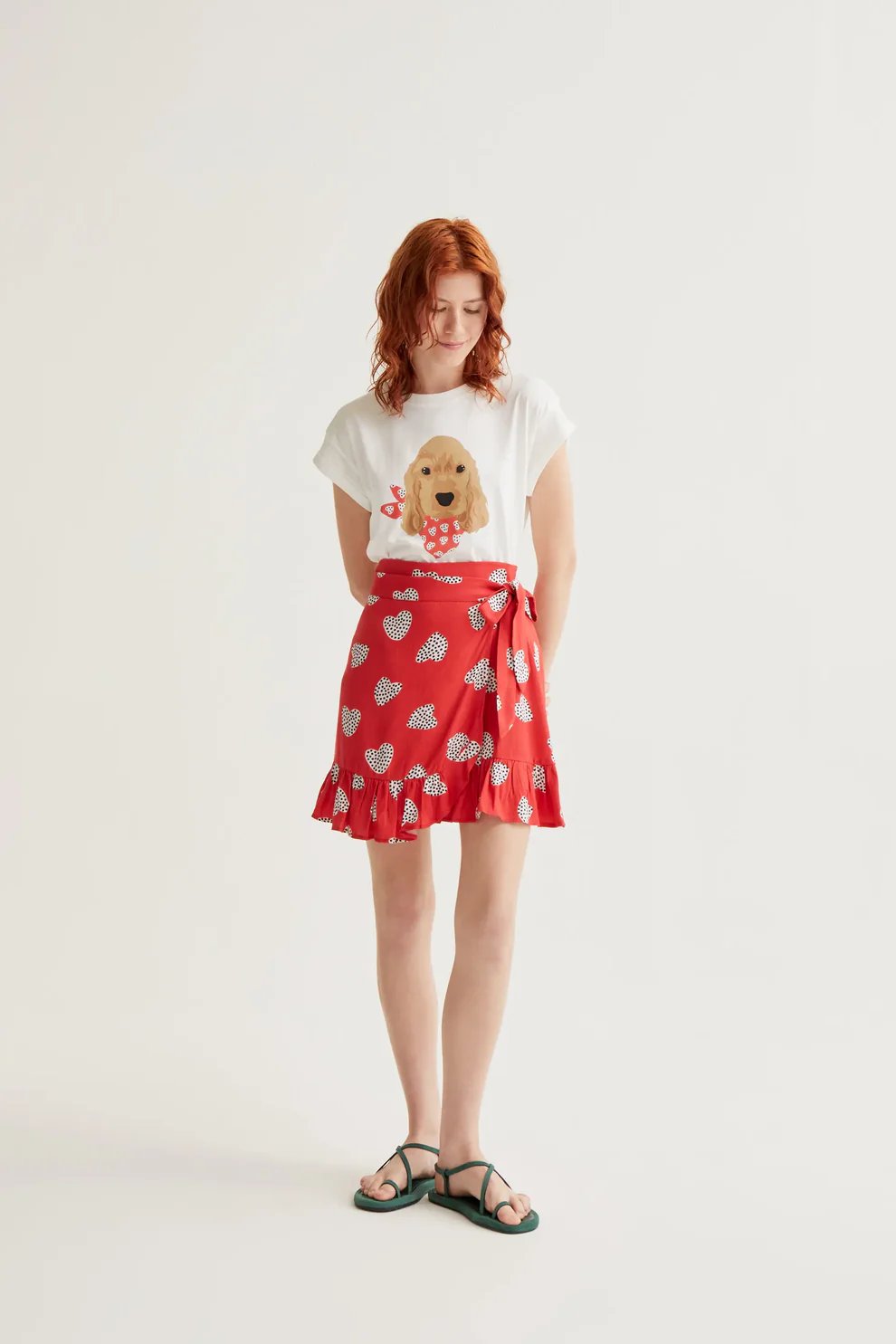 Camiseta de tejido 100% algodón con estampado de perrito coker. Cuello redondo y manga corta. Hombro ligeramente caído. La modelo mide 175 cm y lleva la talla S.