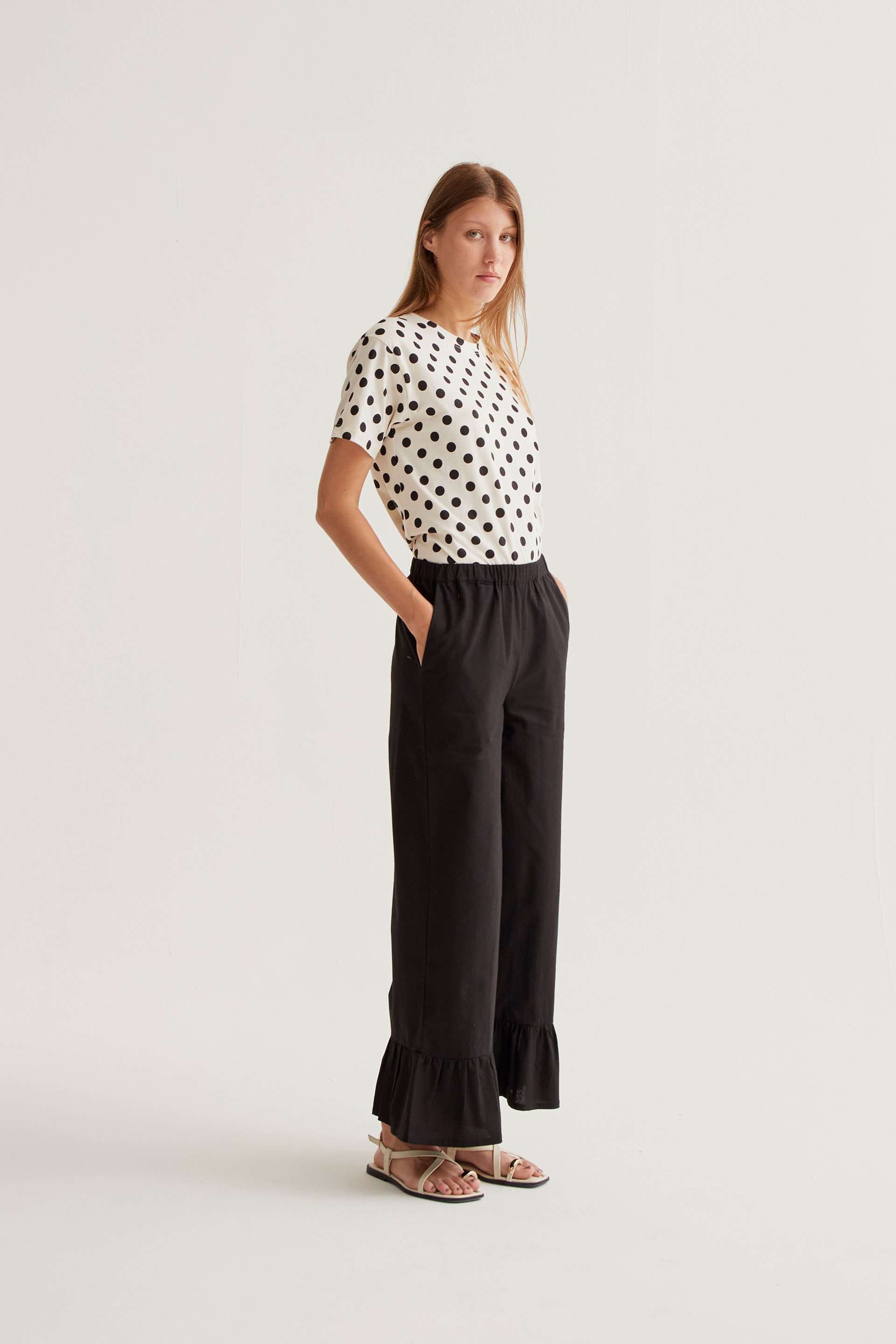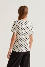 Camiseta de tejido 100% algodón con estampado black dots. Cuello redondo y manga corta. La modelo mide 177 cm y lleva la talla S.