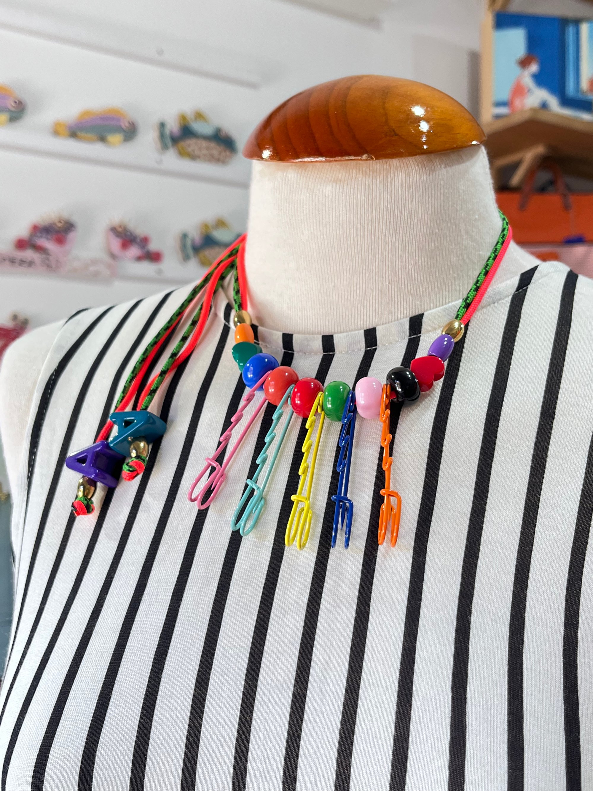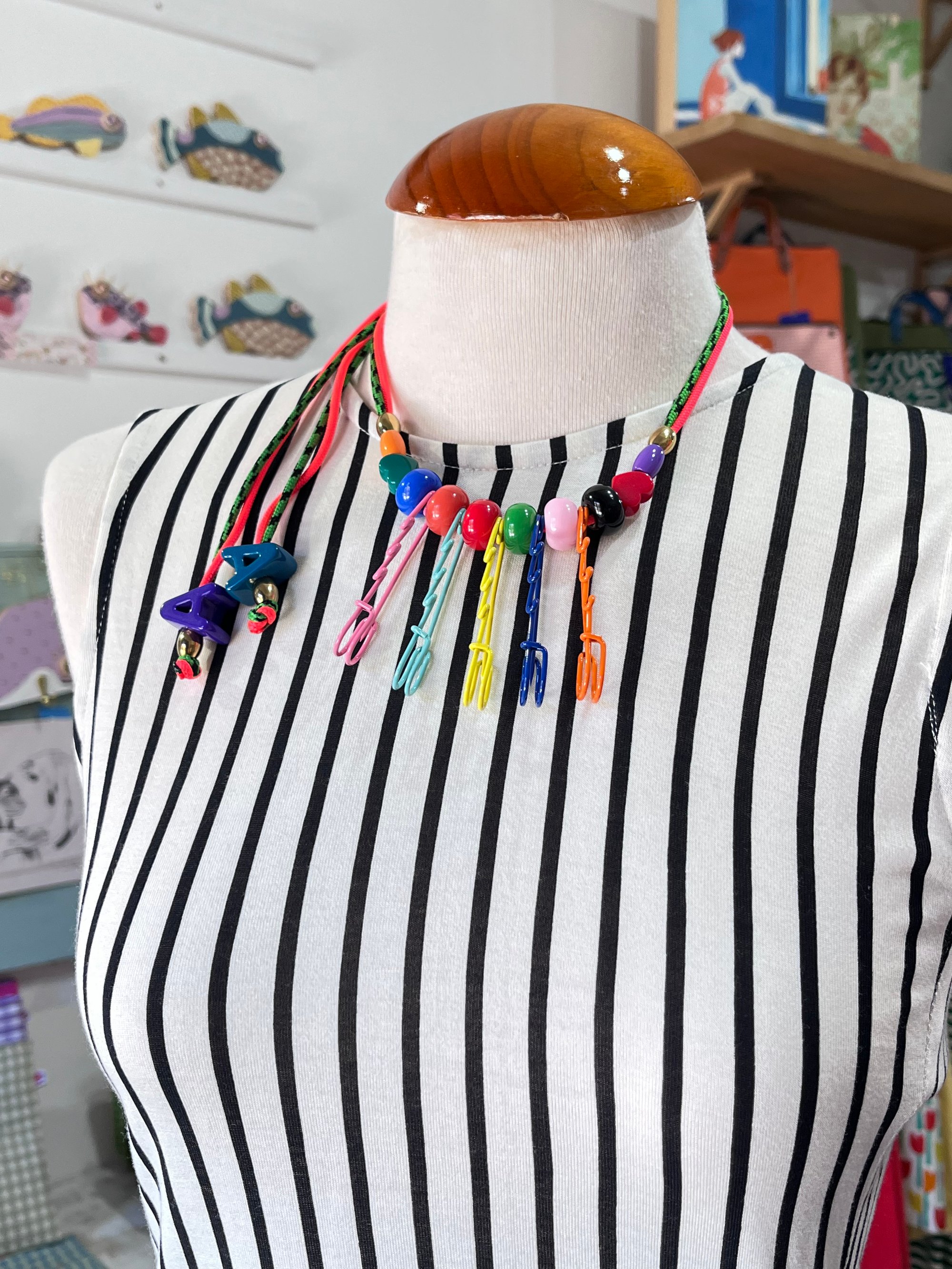 Este collar con elementos multicolores es tan bonito que será el el centro de las miradas. Puedes regularlo en altura, dejando los charms del extremo más largos o cortos.