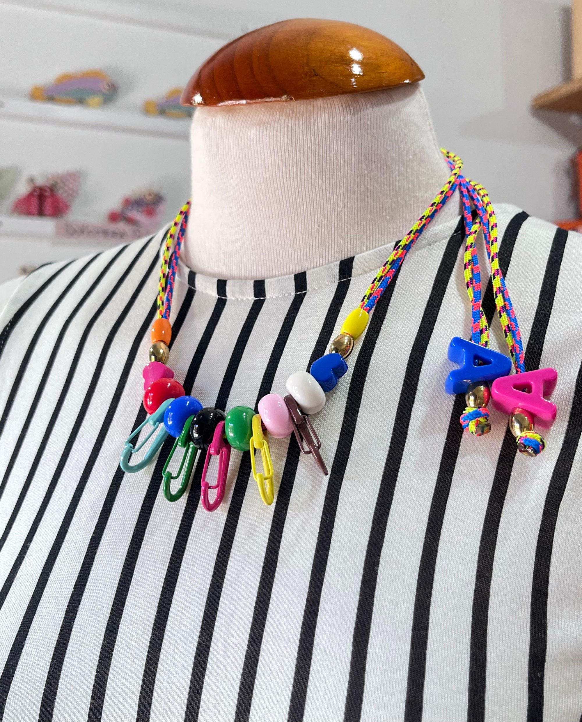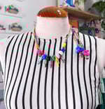 Este collar con elementos multicolores es tan bonito que será el el centro de las miradas. Puedes regularlo en altura, dejando los charms del extremo más largos o cortos.
