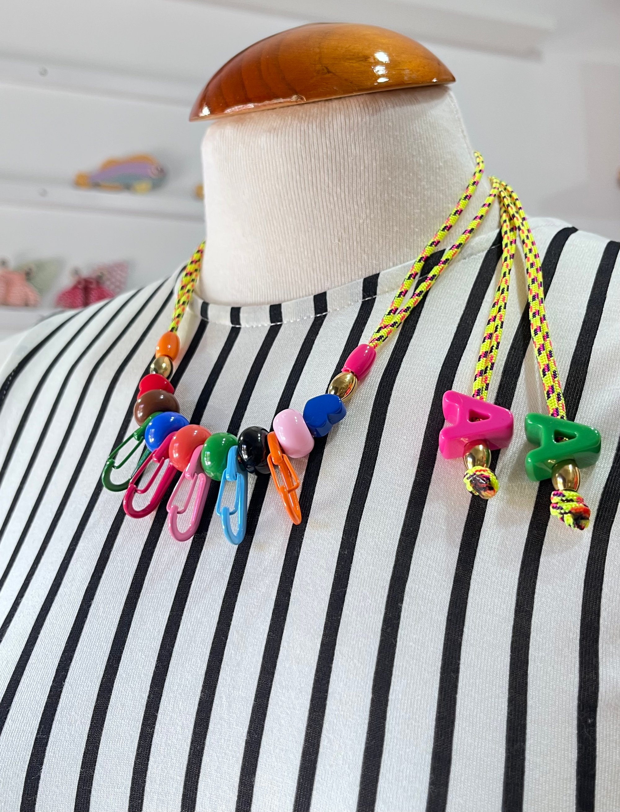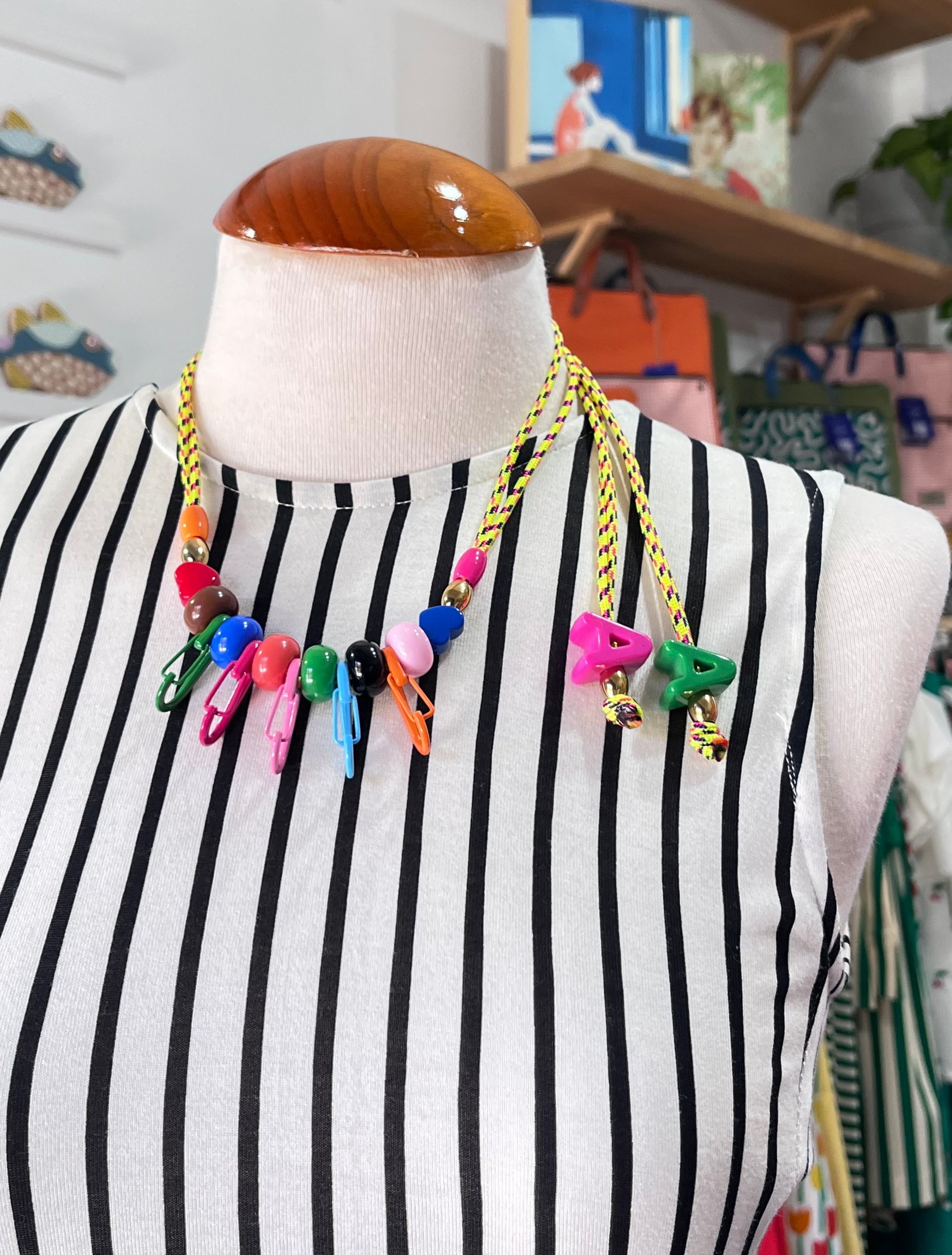 Este collar con elementos multicolores es tan bonito que será el el centro de las miradas. Puedes regularlo en altura, dejando los charms del extremo más largos o cortos.