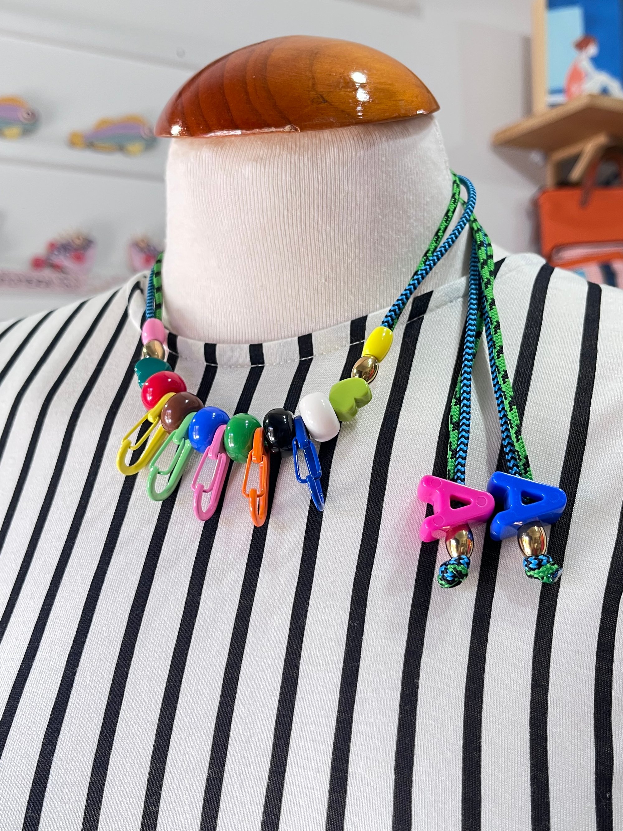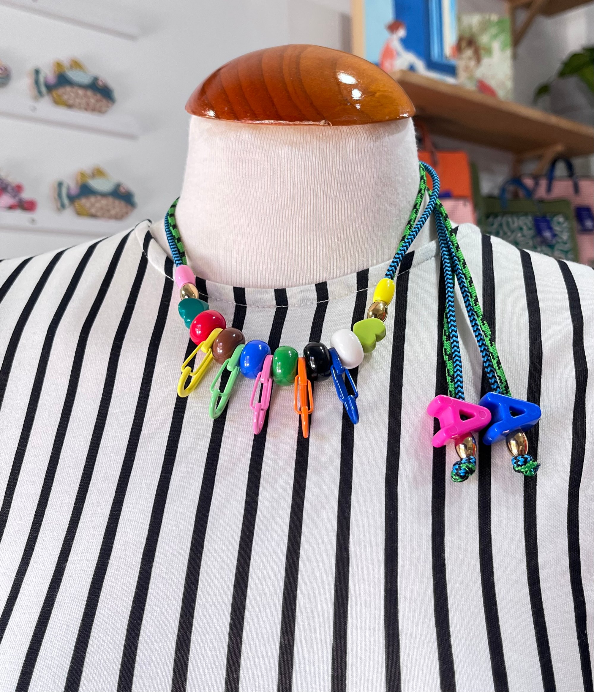 Este collar con elementos multicolores es tan bonito que será el el centro de las miradas. Puedes regularlo en altura, dejando los charms del extremo más largos o cortos.
