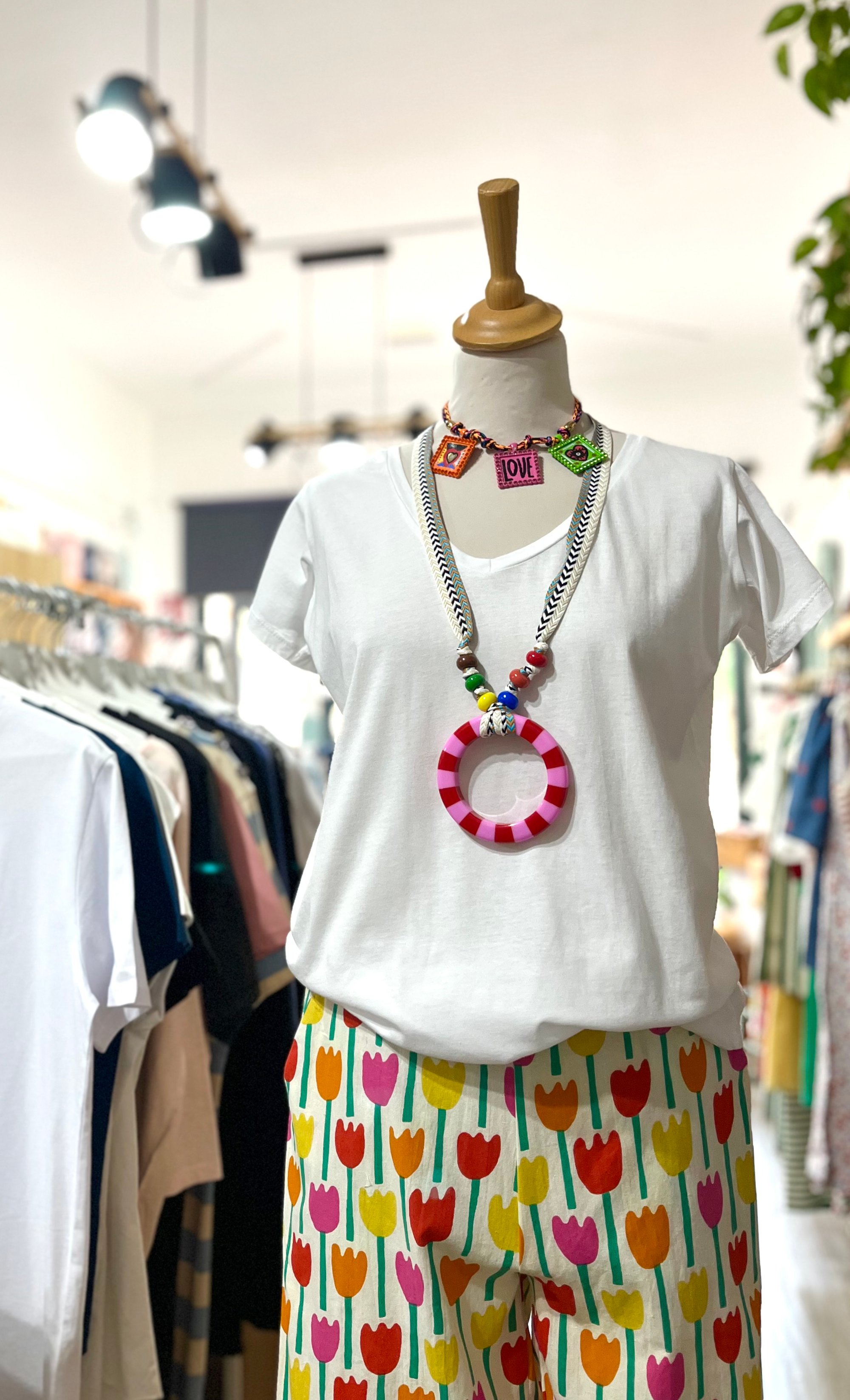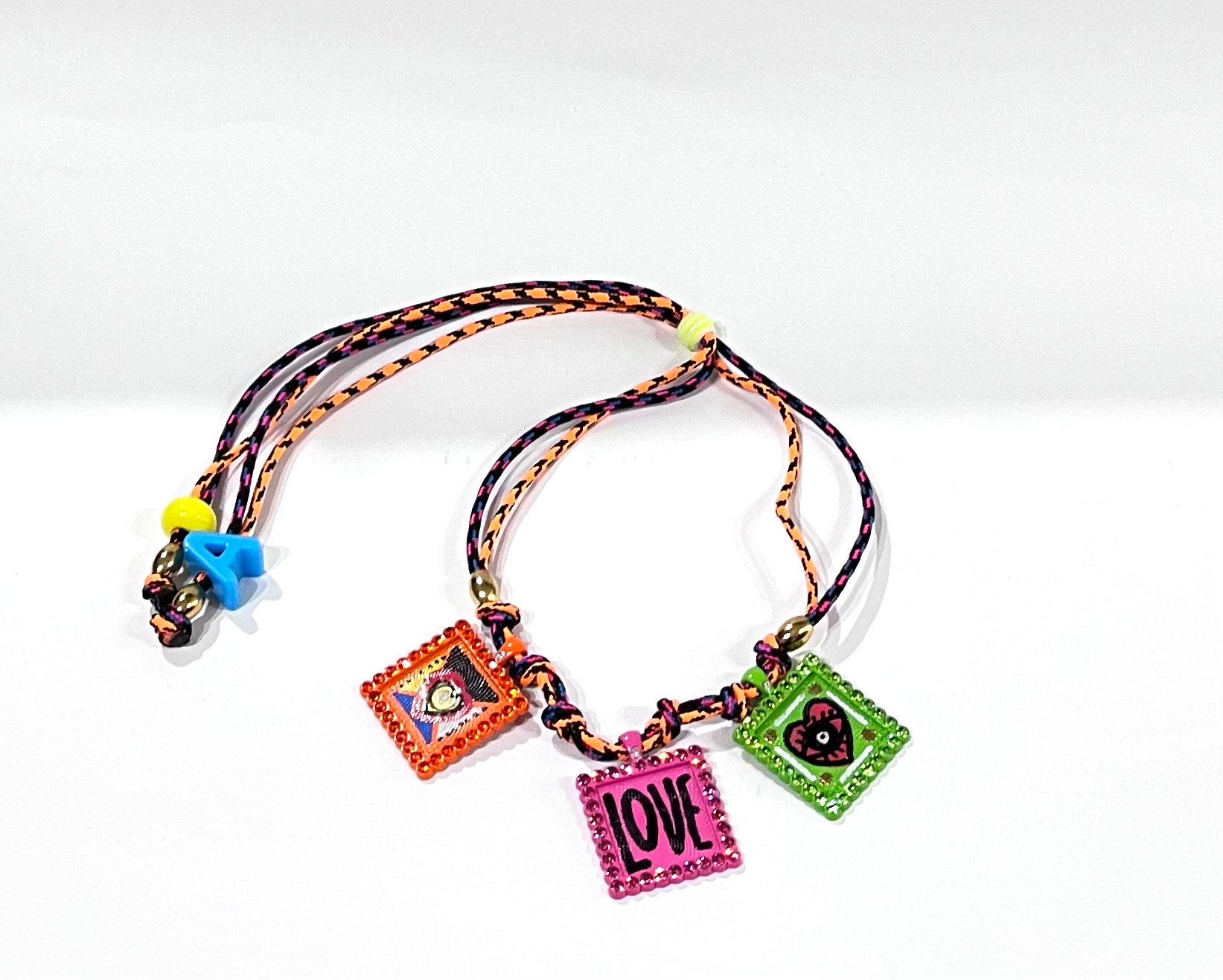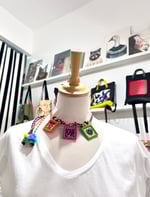 Este collar con elementos multicolores es tan bonito que será el el centro de las miradas. Puedes regularlo en altura, dejando los charms del extremo más largos o cortos.