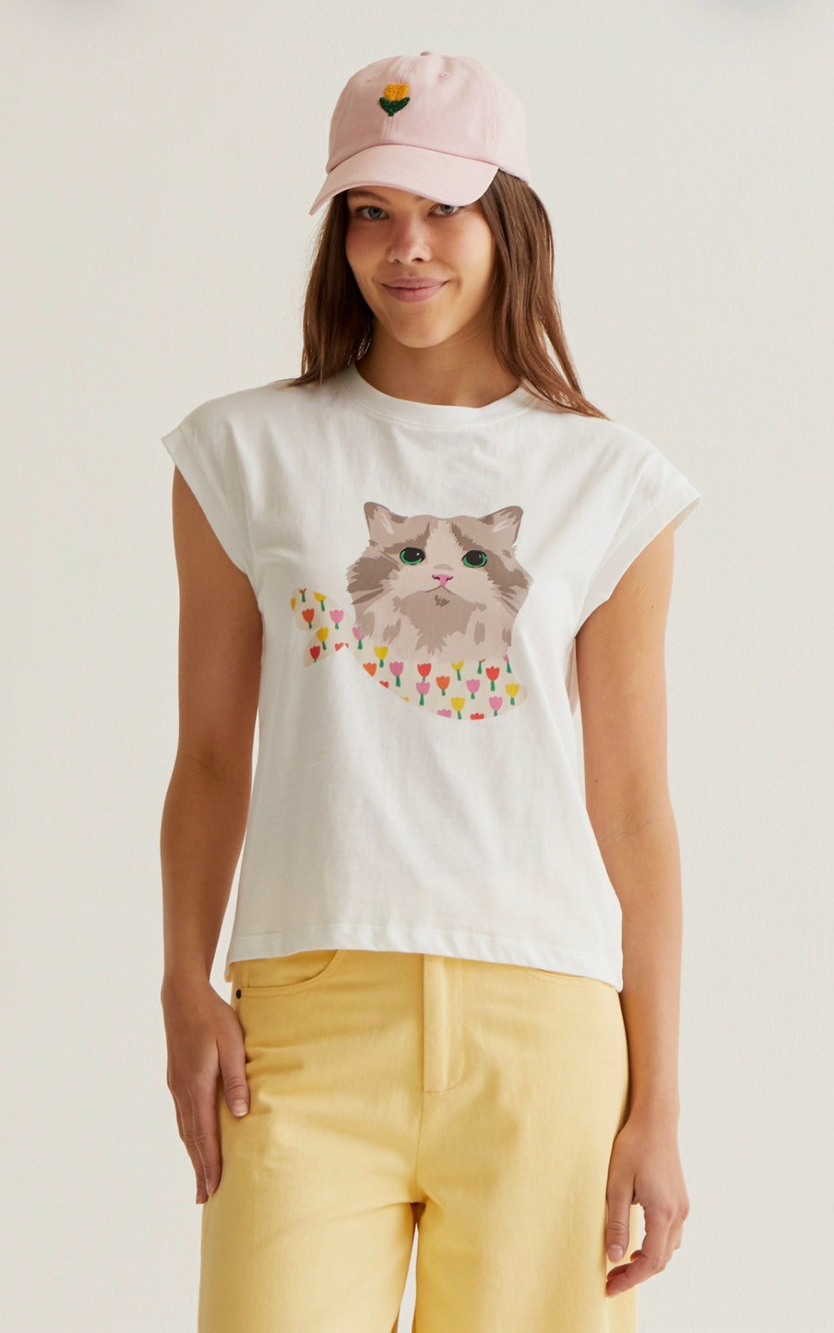 Camiseta de tejido 100% algodón con estampado de gatito. Cuello redondo y manga corta. Hombro ligeramente caído. La modelo mide 175 cm y lleva la talla S.