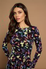 Vestido midi de cuello redondo y manga larga. Estampado animal print. Falda con fruncido y abertura en lateral. Tejido elástico. Forro interior elástico. Cierre con cremallera lateral izquierda oculta en costura.