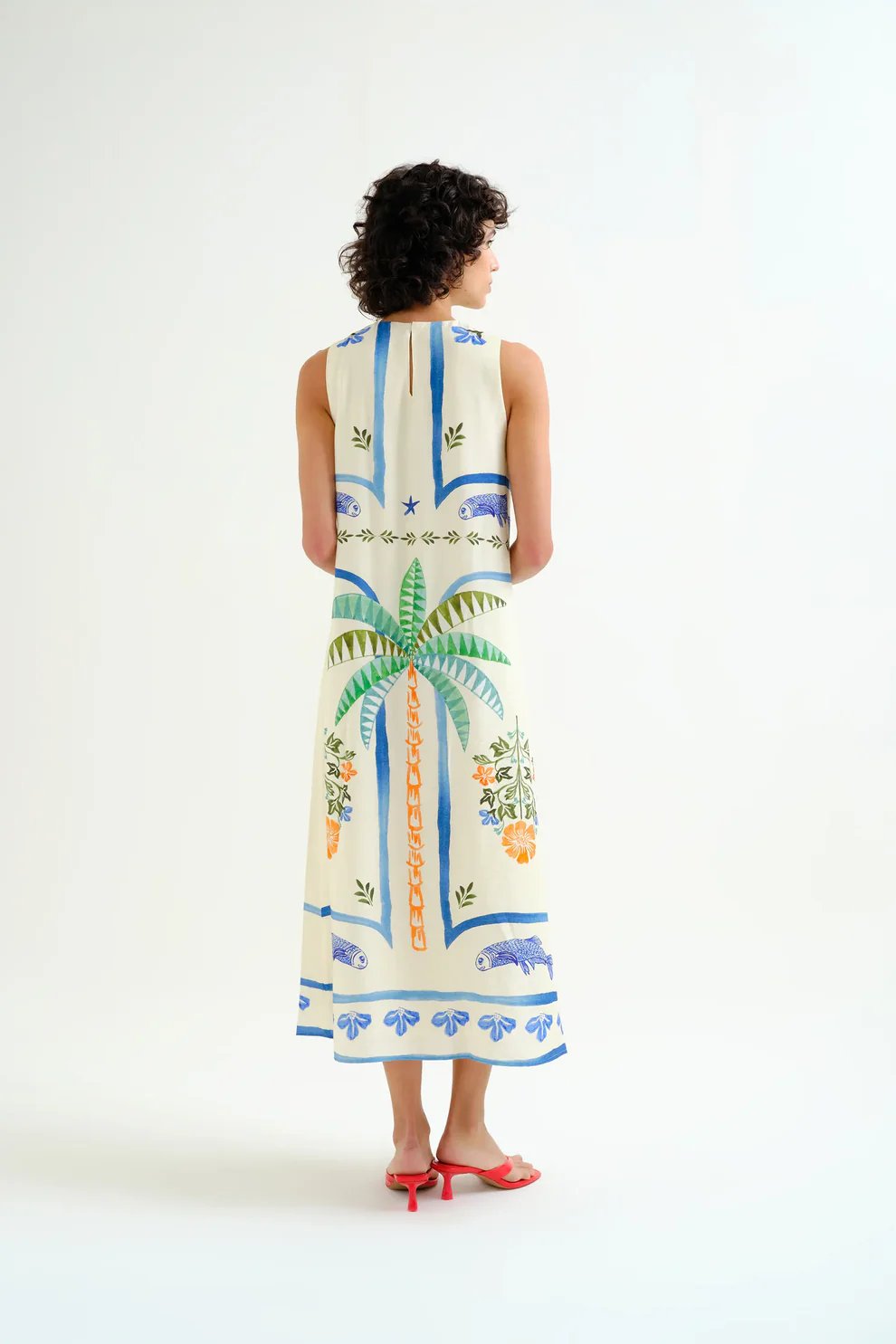 Vestido largo de tejido de crepé con estampado palm & mermaid. Cuello redondo y sin mangas. Corte fluído.Forro interior. La modelo mide 175 cm y lleva la talla S.