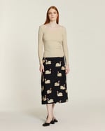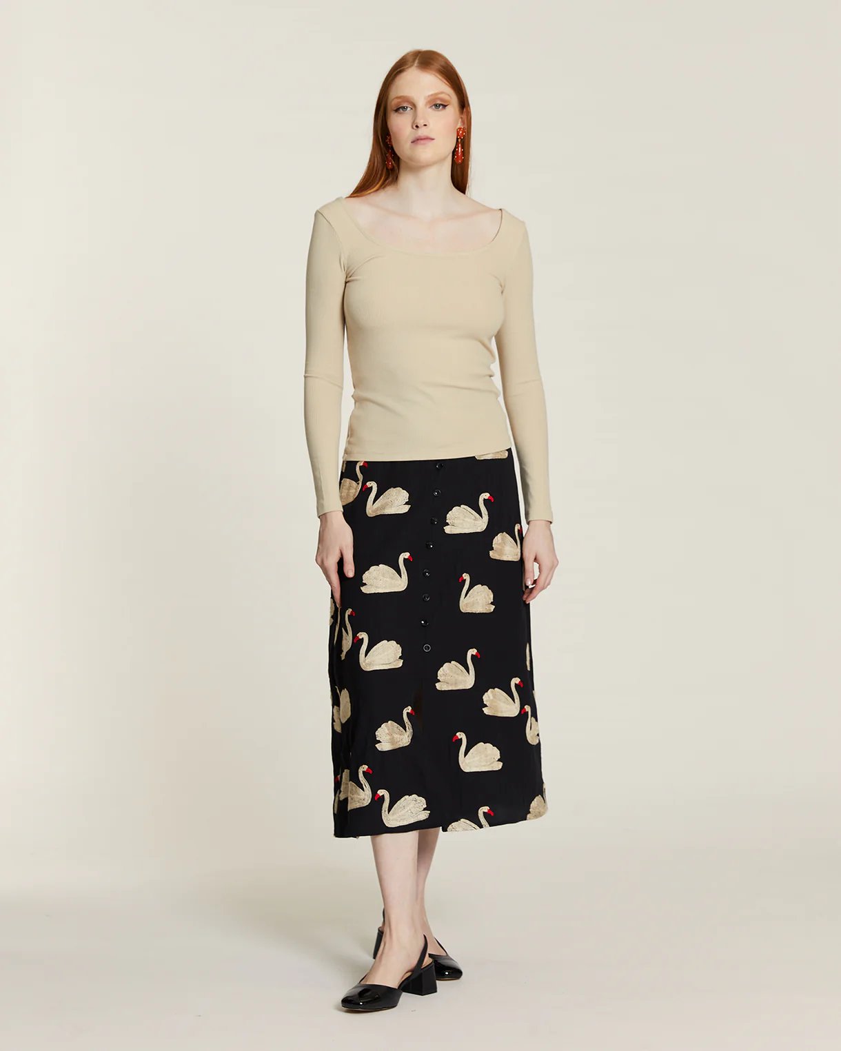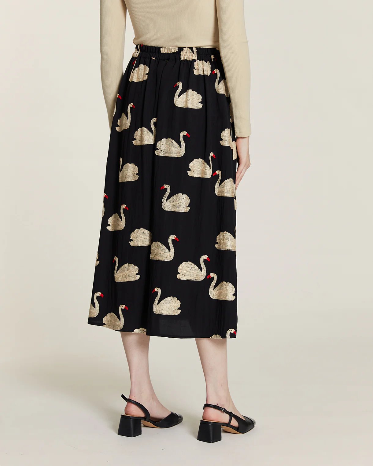 Falda bordado cisnes, con raja delantera, cinturilla elástica por el trasero, por debajo de la rodilla.