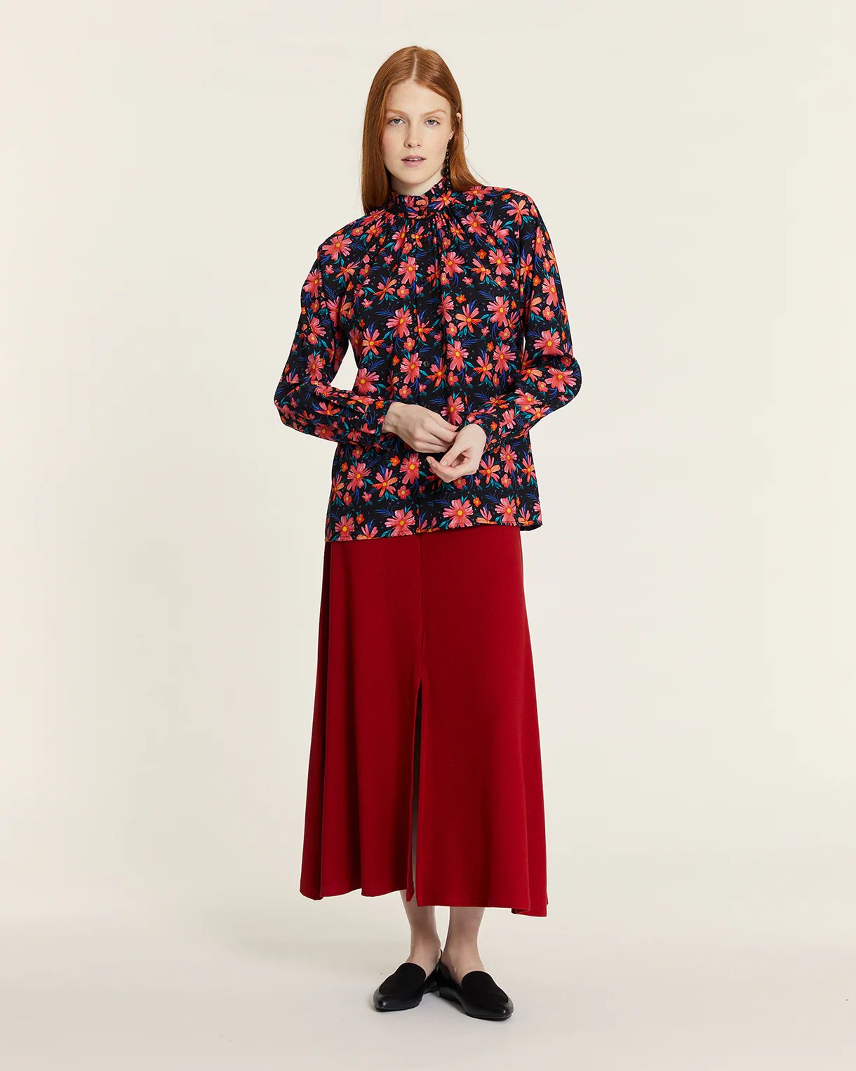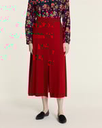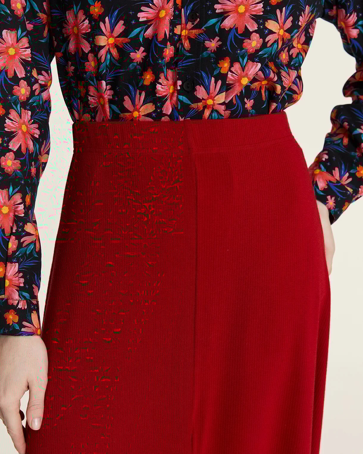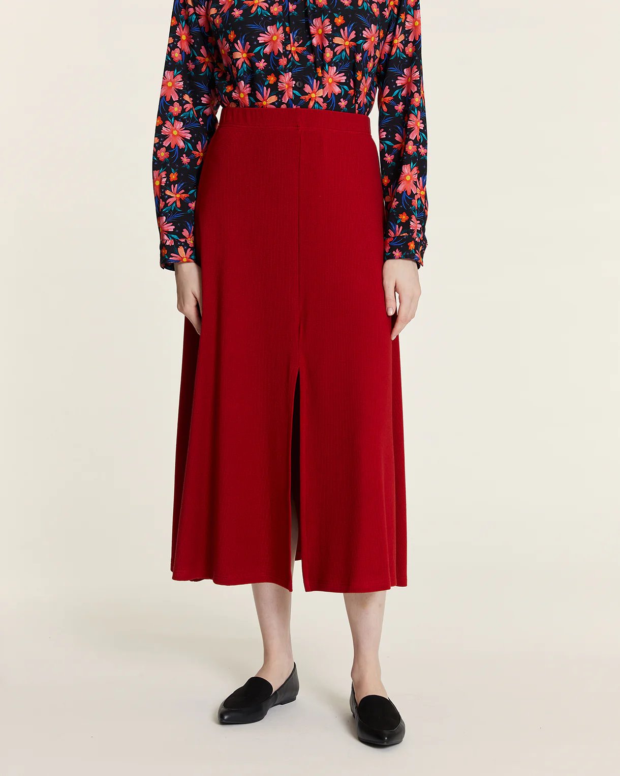 Falda de canalé con vuelo, cinturilla elástica y abertura delantera. Largo por encima del tobillo.