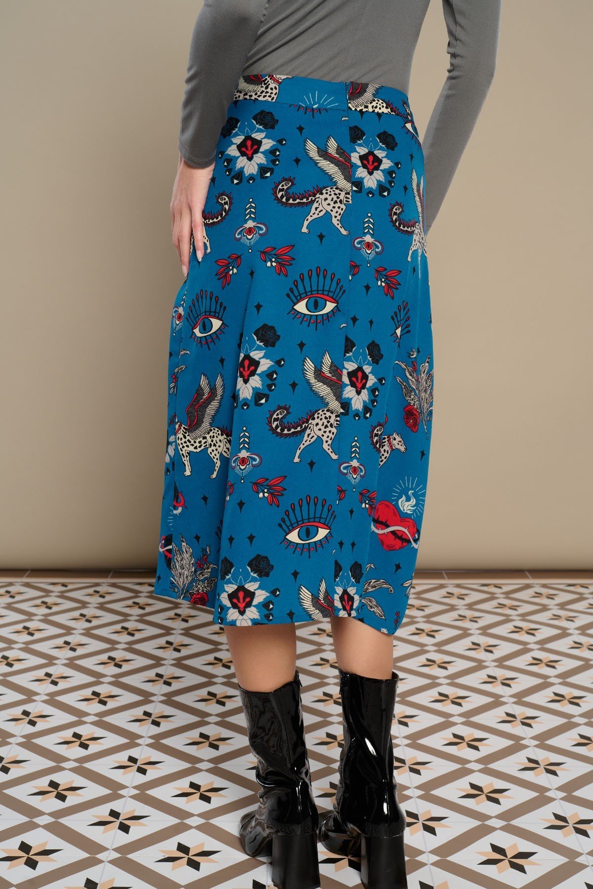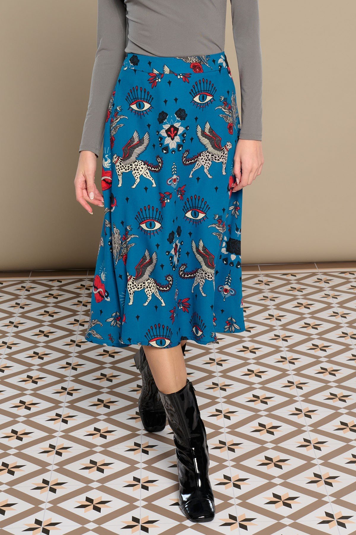 Falda midi de tiro medio. Forro interior. Estampado místico de gatos alados y corazones. Cierre con cremallera trasera oculta en costura.