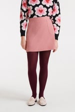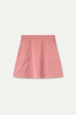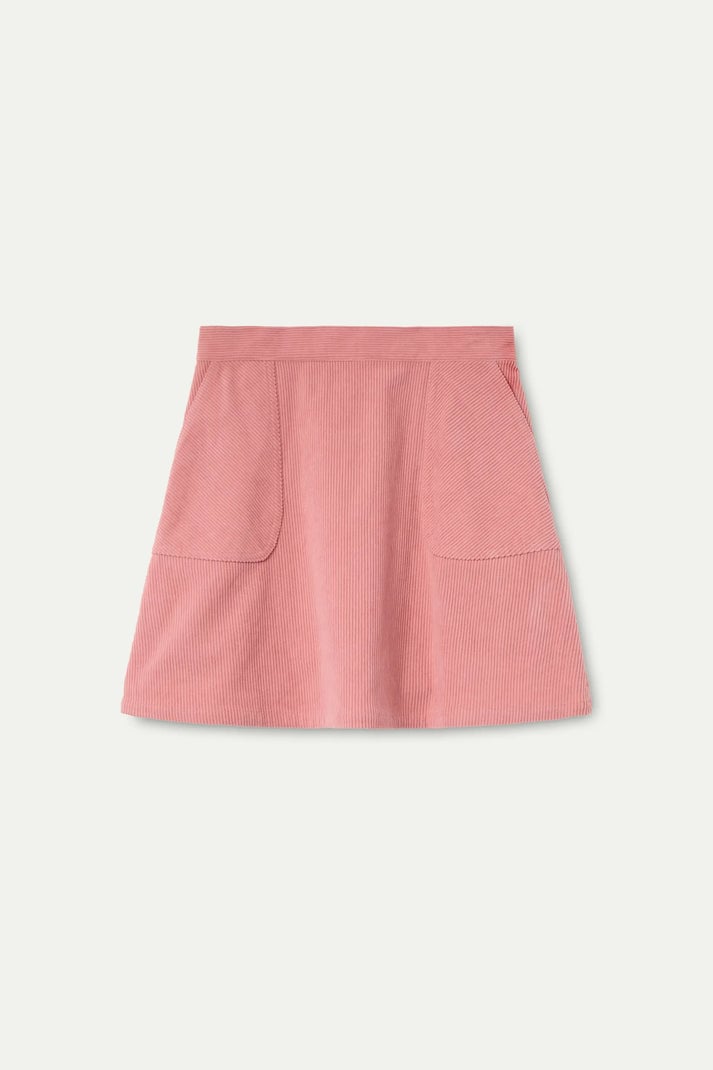 Falda corta con tejido de pana color rosa. Con cintura fija tiro alto. Bolsillos laterales. La modelo mide 177 cm y lleva la talla S.