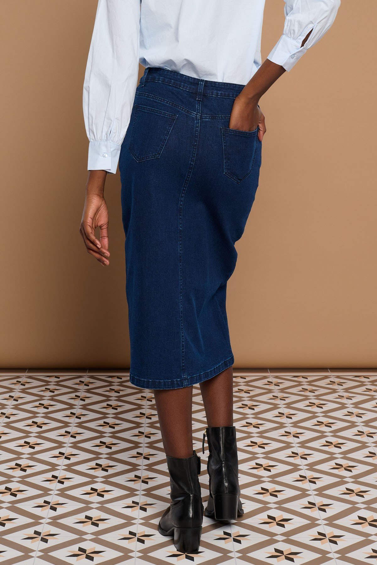 Falda vaquera midi de tiro alto con botones en frontal y estrellas en riped. Con elastano. Cierre con botón frontal y cremallera oculta.