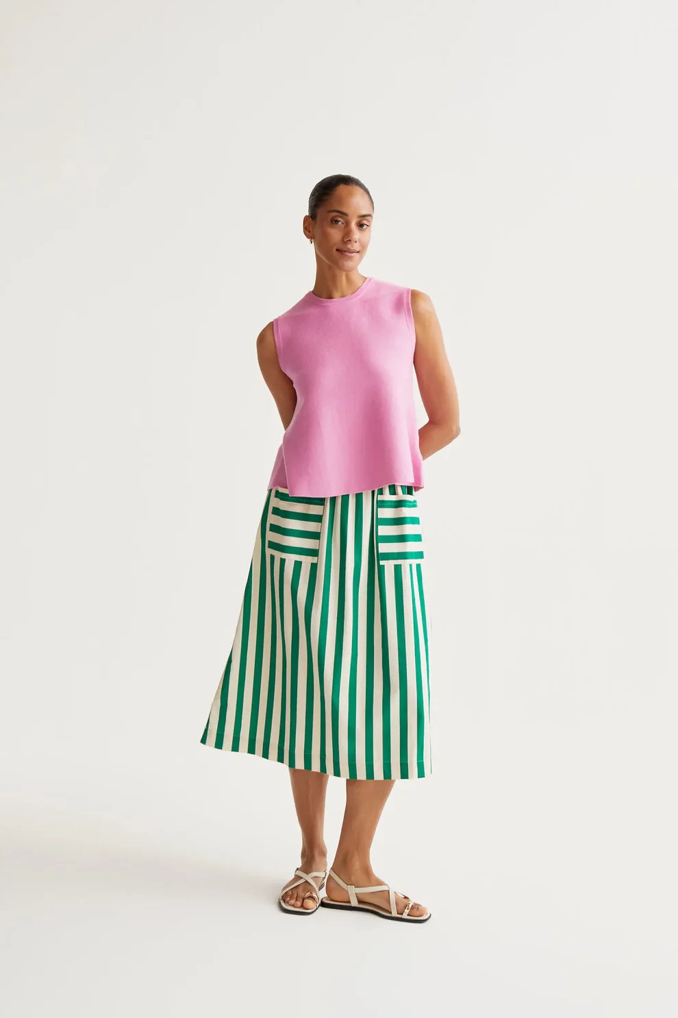 Falda midi de tejido 100% algodón con estampado bamboo green. Cintura fija elástica de tiro alto. Bolsillos frontales funcionales. Corte amplio. La modelo mide 173 cm y lleva la talla S.