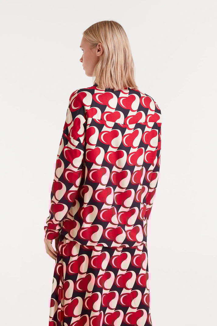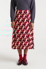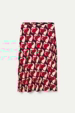 Falda midi de tejido viscosa twill con estampado Heart Attack. Cintura fija de tiro alto con cremallera invisible lateral. La modelo mide 178 cm y lleva la talla S.