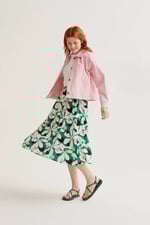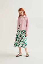 Falda midi de tejido crepé ligero con estampado hosta. Cintura fija elástica de tiro alto. Forro interior. Corte fluído. La modelo mide 175 cm y lleva la talla S.
