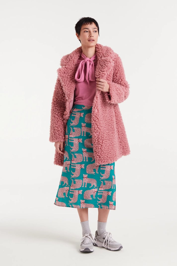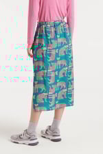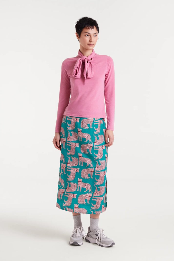 Falda midi de tejido crepé ligero con estampado Onca. Cintura con goma elástica trasera. Detalle de aperturas laterales. Forro interior. Abertura lateral. La modelo mide 177 cm y lleva la talla S.