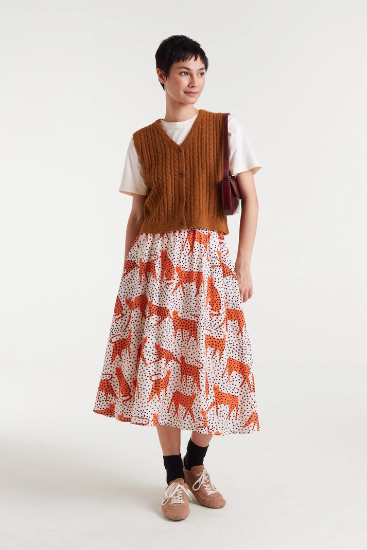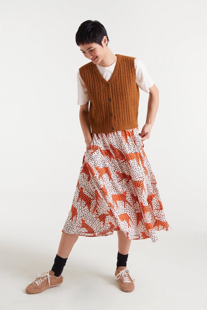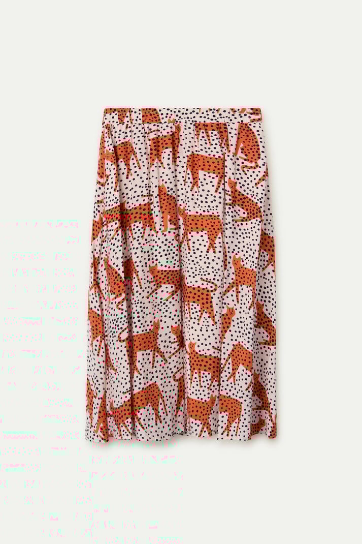 Falda midi de tejido crepé ligero con estampado Tano. Cintura con goma elástica. Forro interior. La modelo mide 177 cm y lleva la talla S.