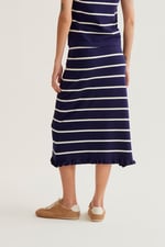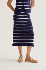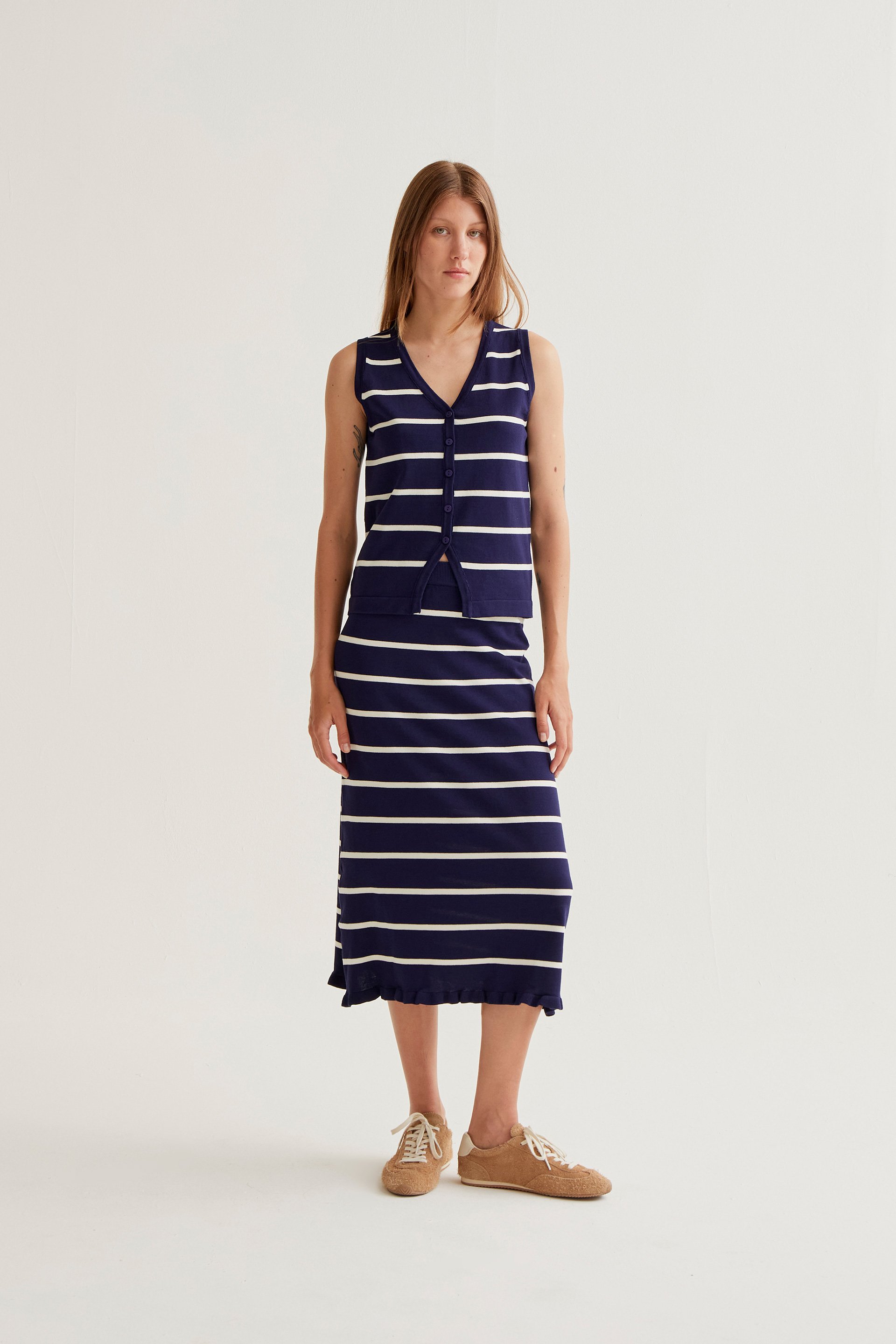 Falda midi de tejido crepé ligero con estampado hosta. Cintura fija elástica de tiro alto. Forro interior. Corte fluído. La modelo mide 175 cm y lleva la talla S.