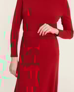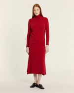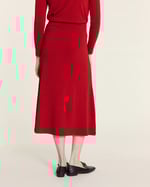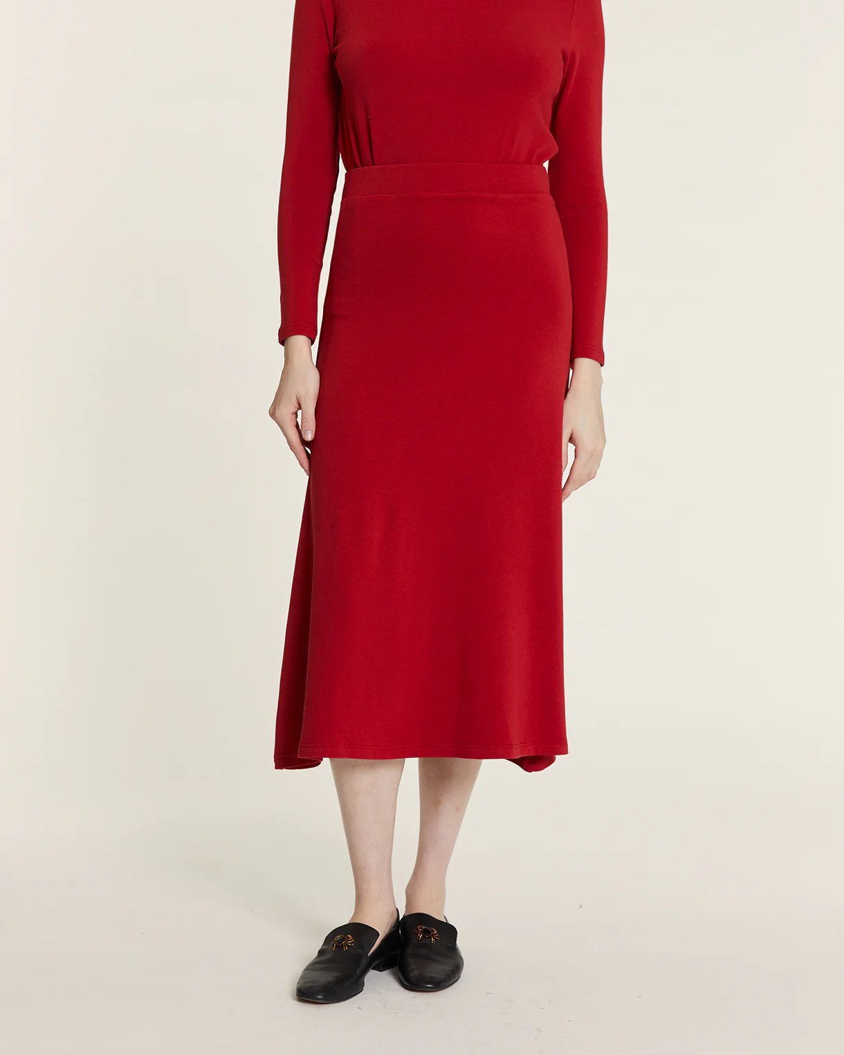 Falda midi evassé rojo, por debajo de la rodilla, con cinturilla elástica.