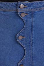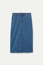 Falda midi de color azul con tejido denim elástico. Cintura fija de tiro alto. Cierre frontal con botones y detalles en forma de onda.La modelo mide 177 cm y lleva la talla S.