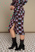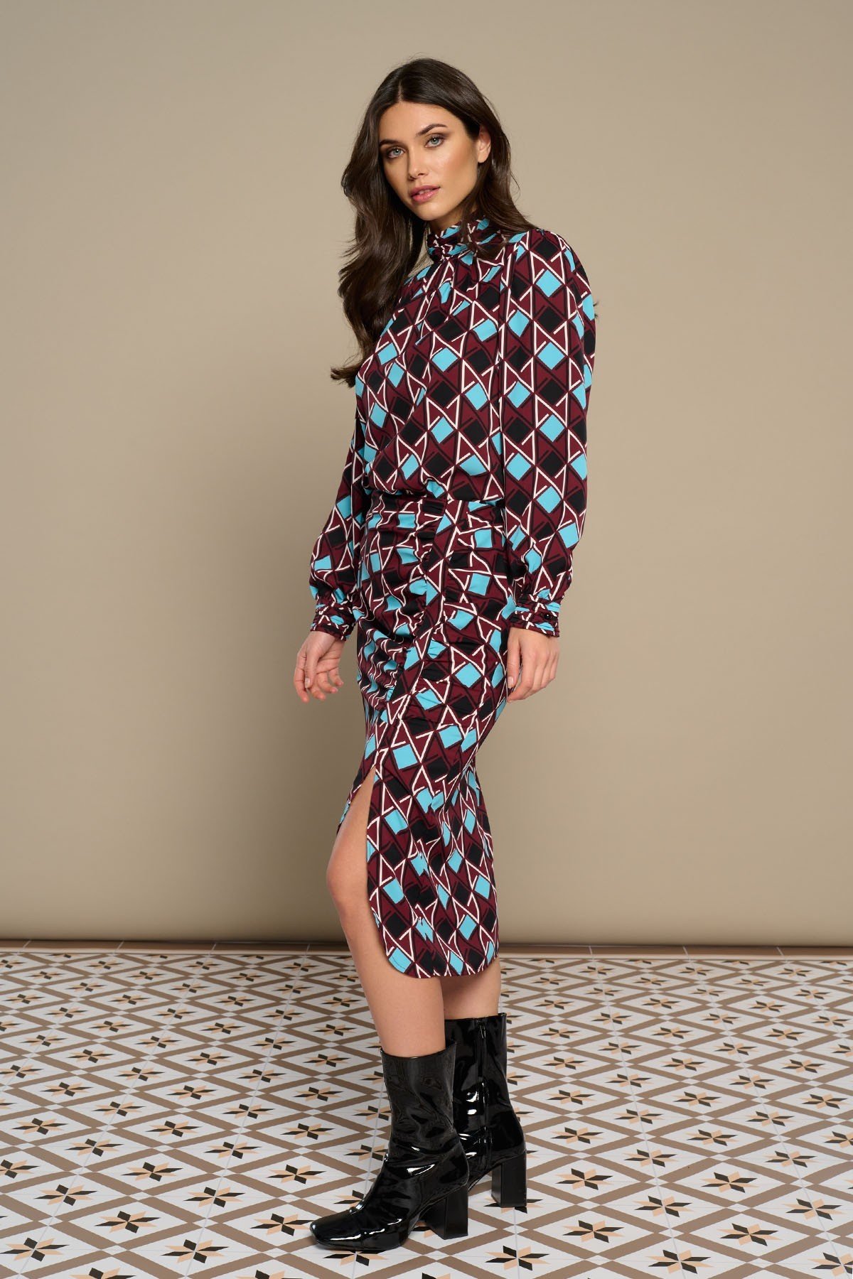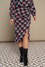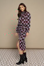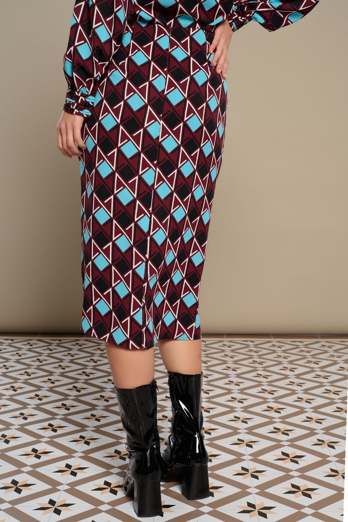 Falda midi de tiro medio con fruncido y abertura lateral. Estampado de gatos geométrico en azul. Negro y burdeos. Cierre con cremallera trasera oculta en costura.