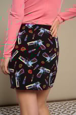 Falda corta de tiro medio. Forro interior. Estampado Guns, Roses & Lipstick.