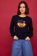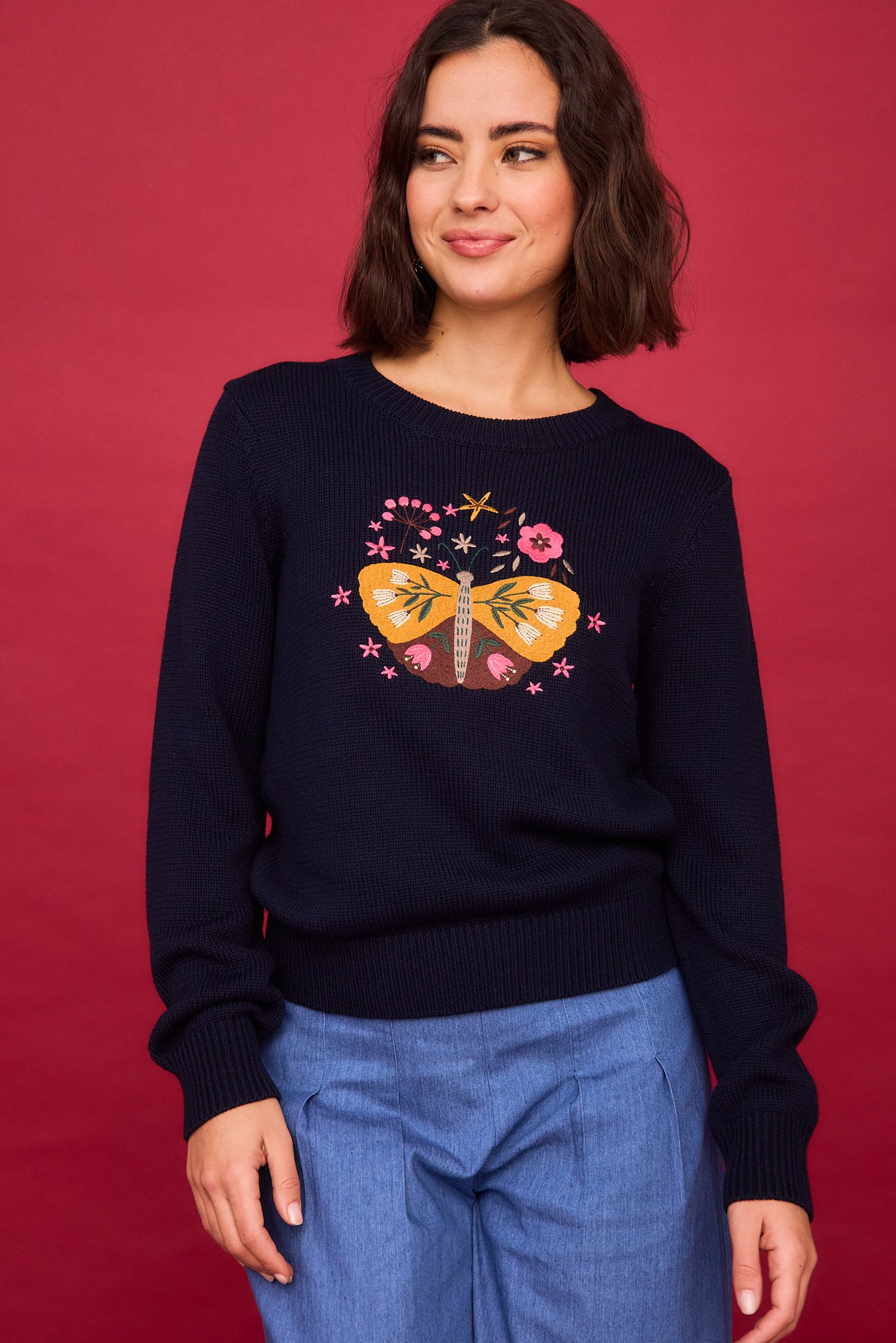 Jersey cuello caja con bordado de mariposa en el pecho. Alucinante
