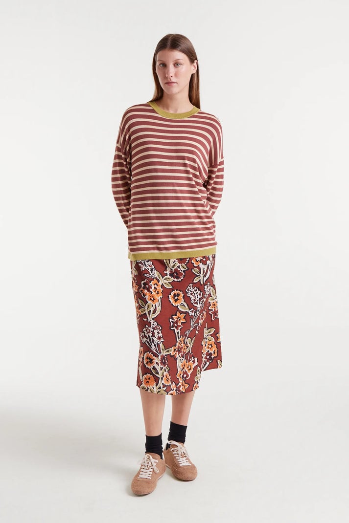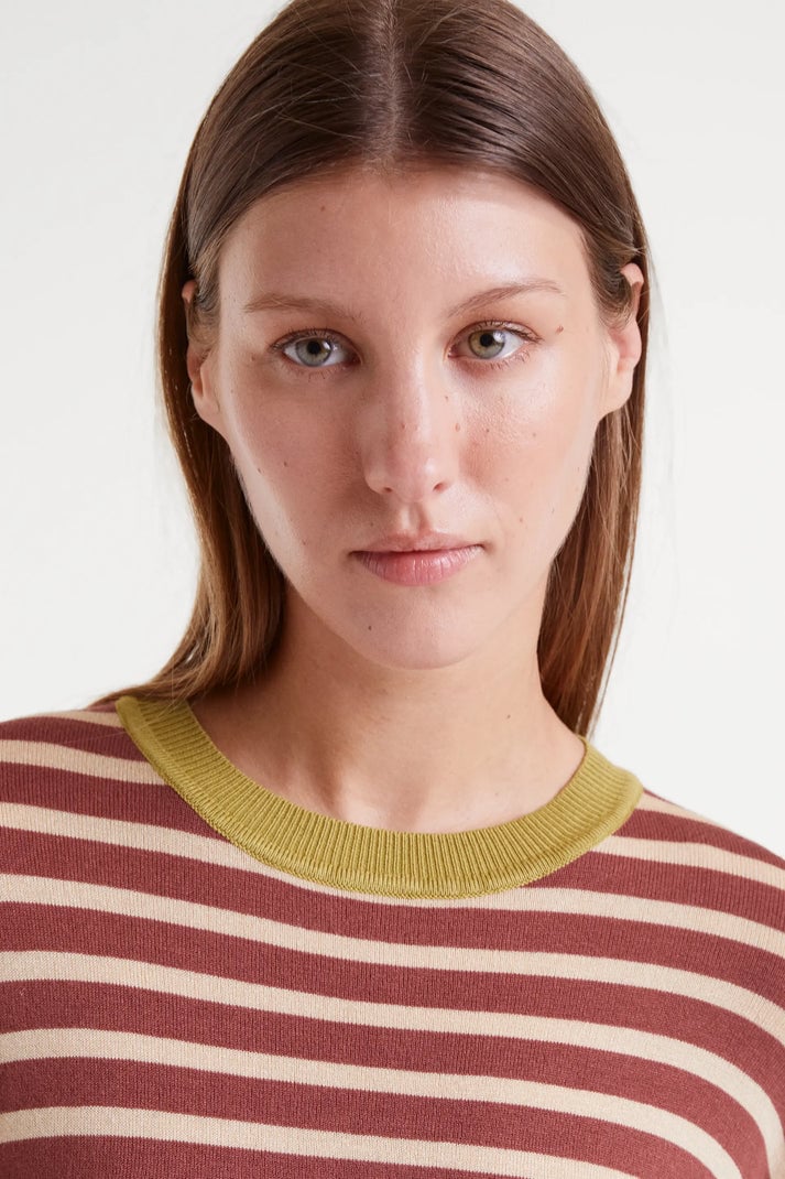 Jersey de punto fino con estampado de rayas de colormarrón y beigel. Con cuello pico y manga larga. Detalle de acabados en rib de color verde a contraste.