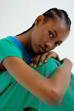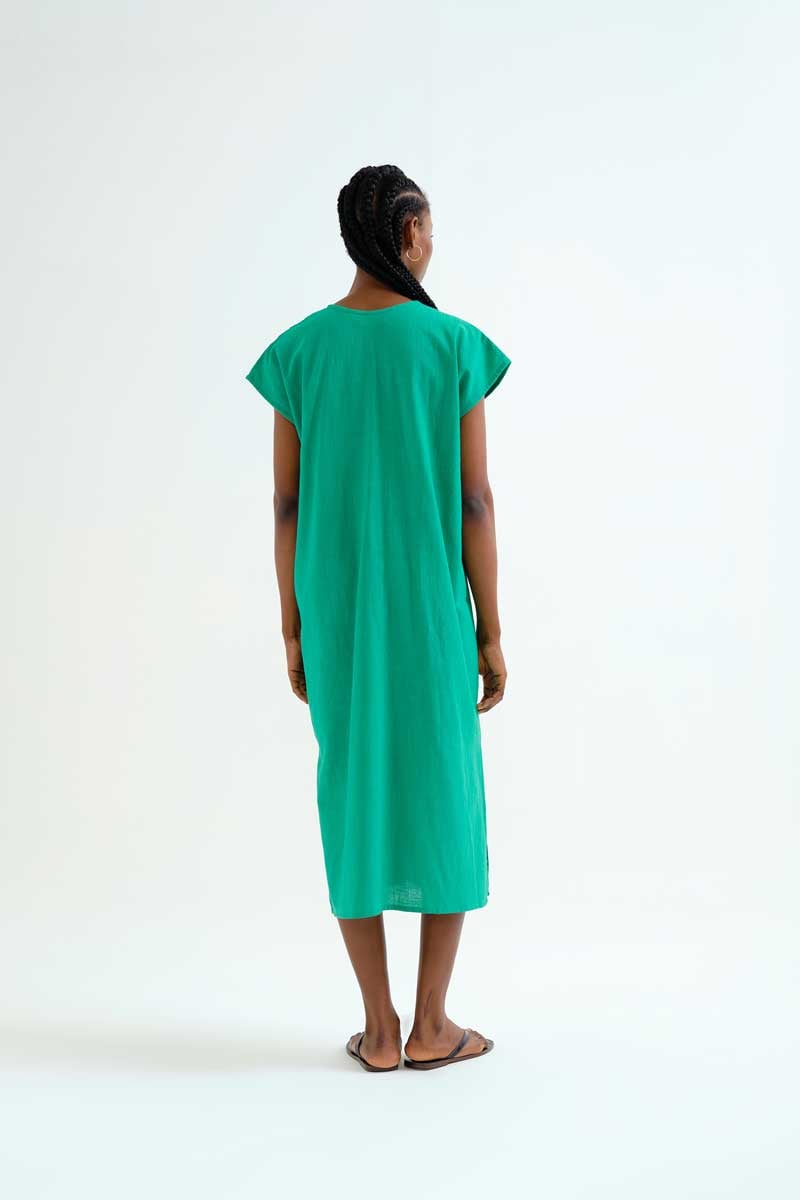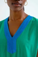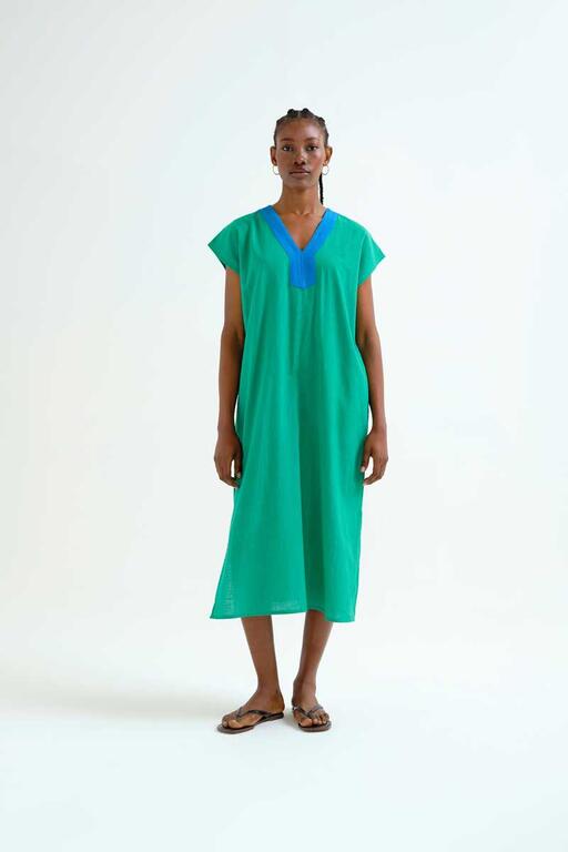 Kaftan largo de tejido 100% algodón de color verde. Escote pico de color azul y sin mangas. Corte amplio. La modelo mide 177 cm y lleva la talla S.