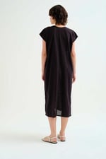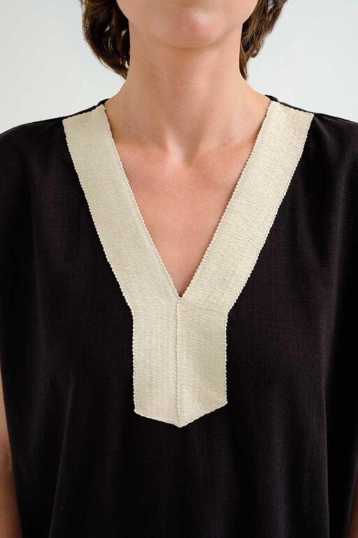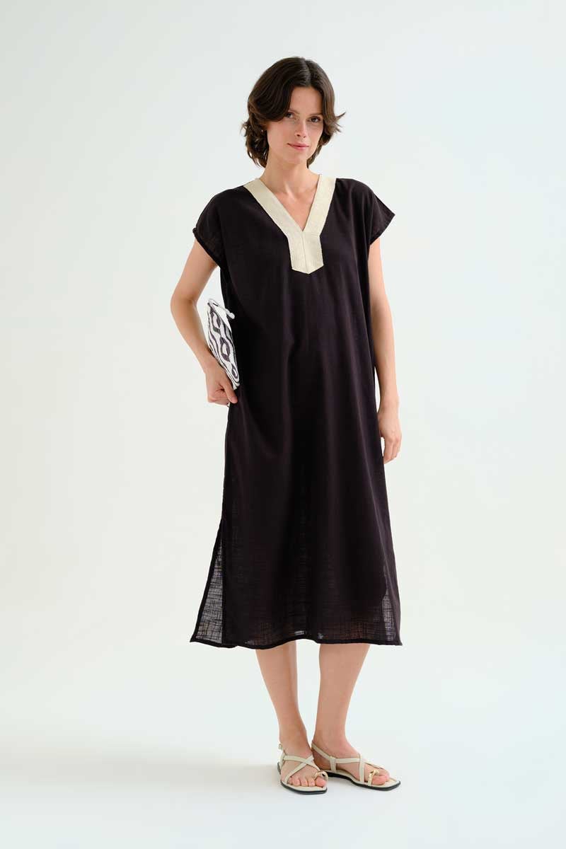 Kaftan largo de tejido 100% algodón de color negro. Escote pico de color crudo y sin mangas. Corte amplio. La modelo mide 177 cm y lleva la talla S.