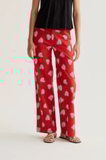 Pantalón de tejido 98% algodón con estampado harmony red. Cintura fija de tiro medio y pernera recta.Cierre frontal con cremallera y botón. Bolsillos laterales. La modelo mide 177 cm y