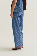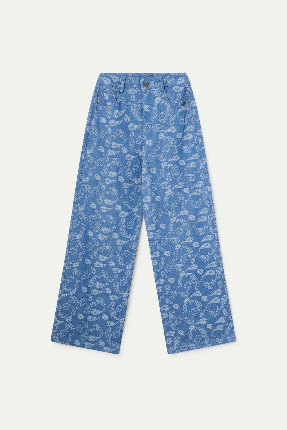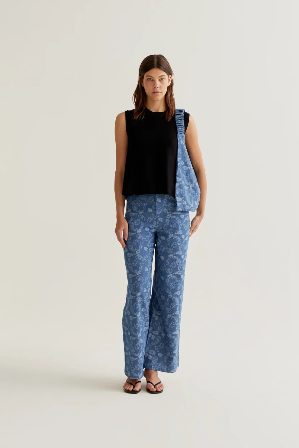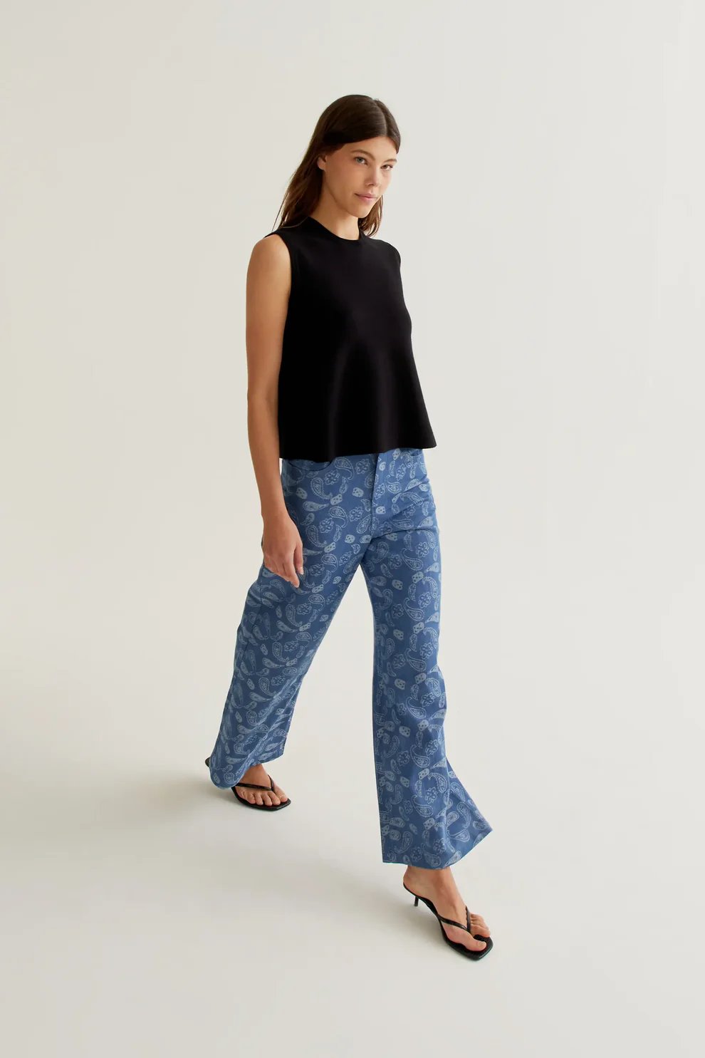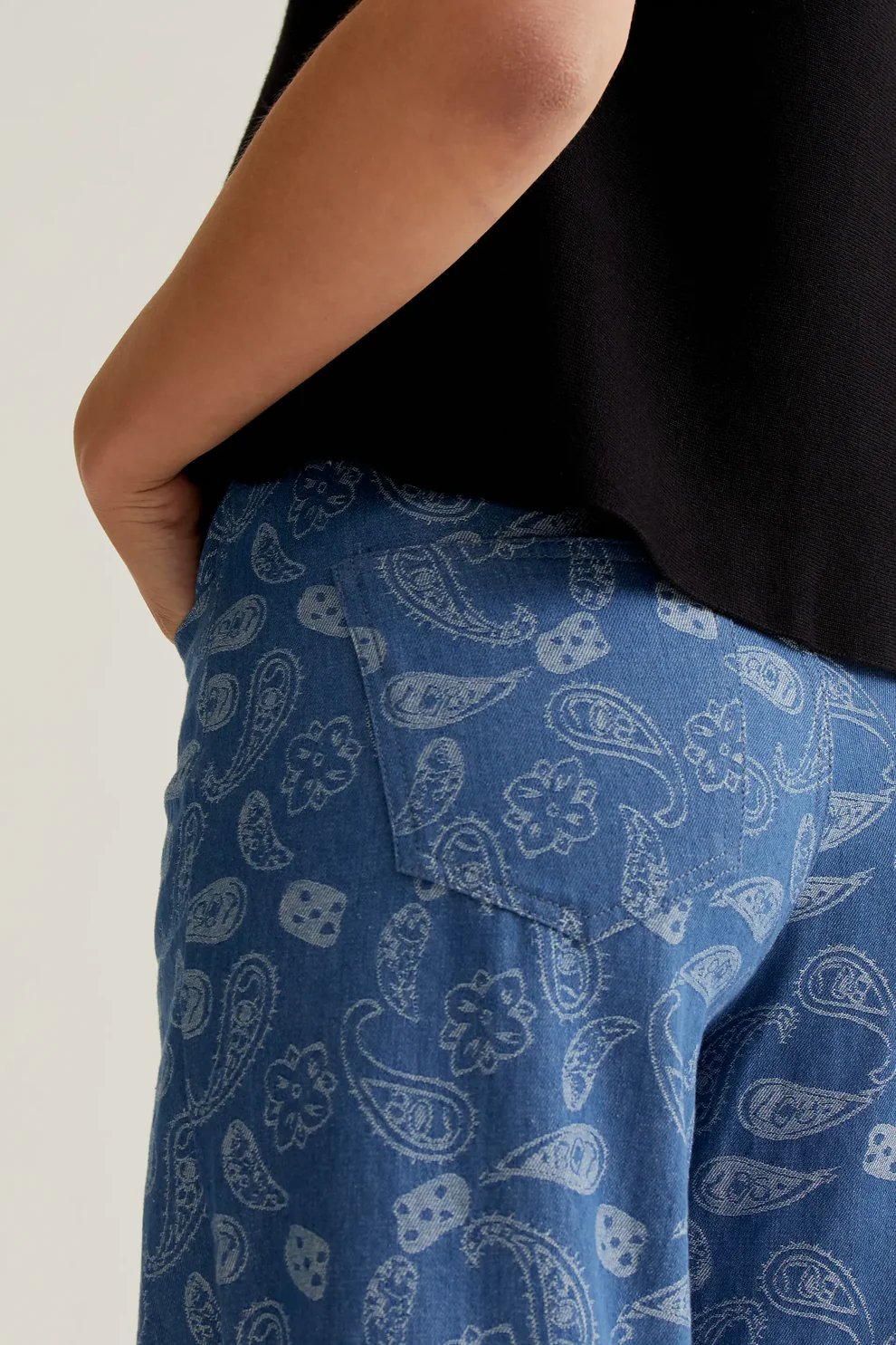 Top de tejido vaquero 100% algodón con estampado paisley. Cuello redondo y sin mangas. Cierre posterior con botón oculto en escote pico. La modelo mide 173 cm y lleva la talla S.