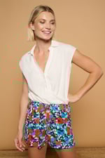 Pantalones cortos de tiro medio. Ajustables a cintura con goma elástica y lazada. Tejido de viscosa y lino.