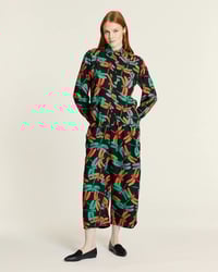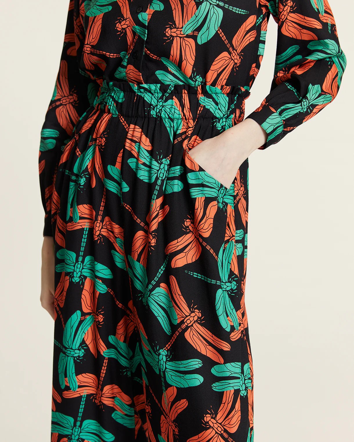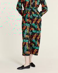 Pantalón culote, cinturilla elástica, bolsillos welt, corte bajo por encima del tobillo.