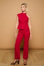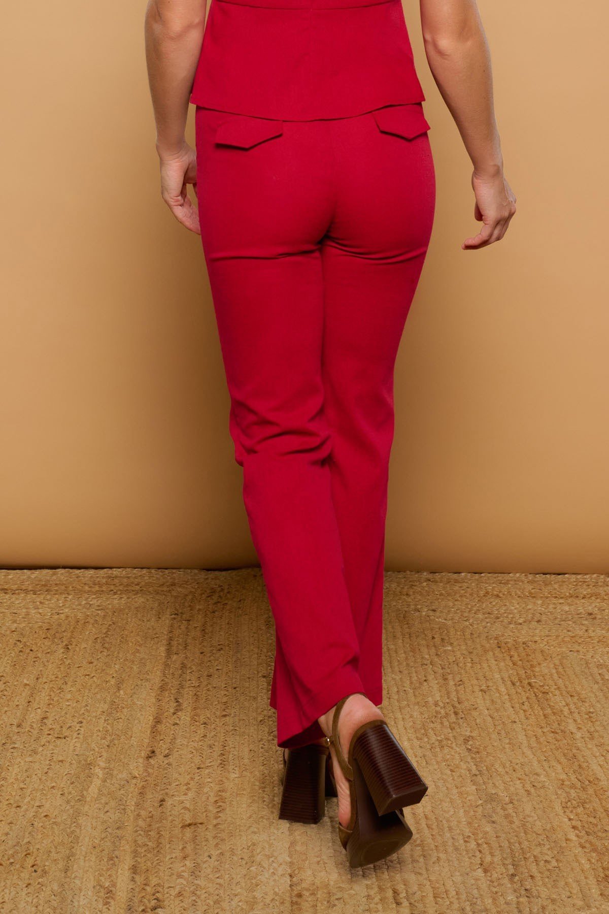 Pantalón de traje de tiro medio y pernera recto. Bolsillos laterales y solapas efecto bolsillo traseras. Cierre con cremallera y botón frontal. Tejido en mezcla de algodón y lino.