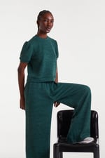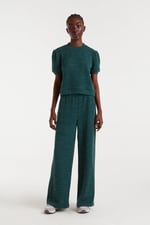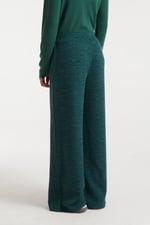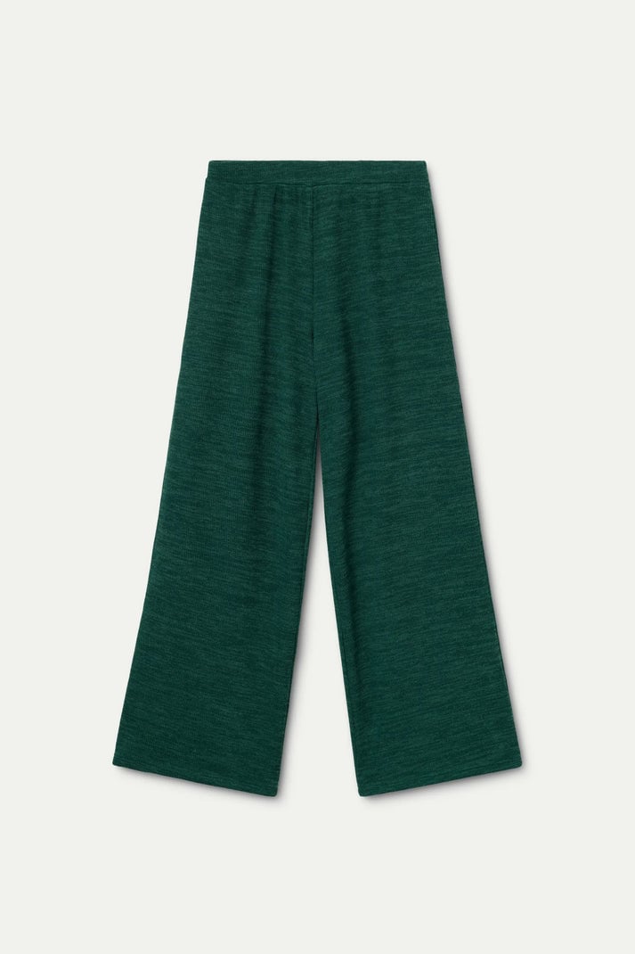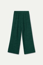 Pantalón con tejido punto canalé de color verde. Cintura con goma elástica de tiro alto y pernera de corte recto. La modelo mide 175 cm y lleva la talla S.