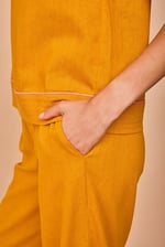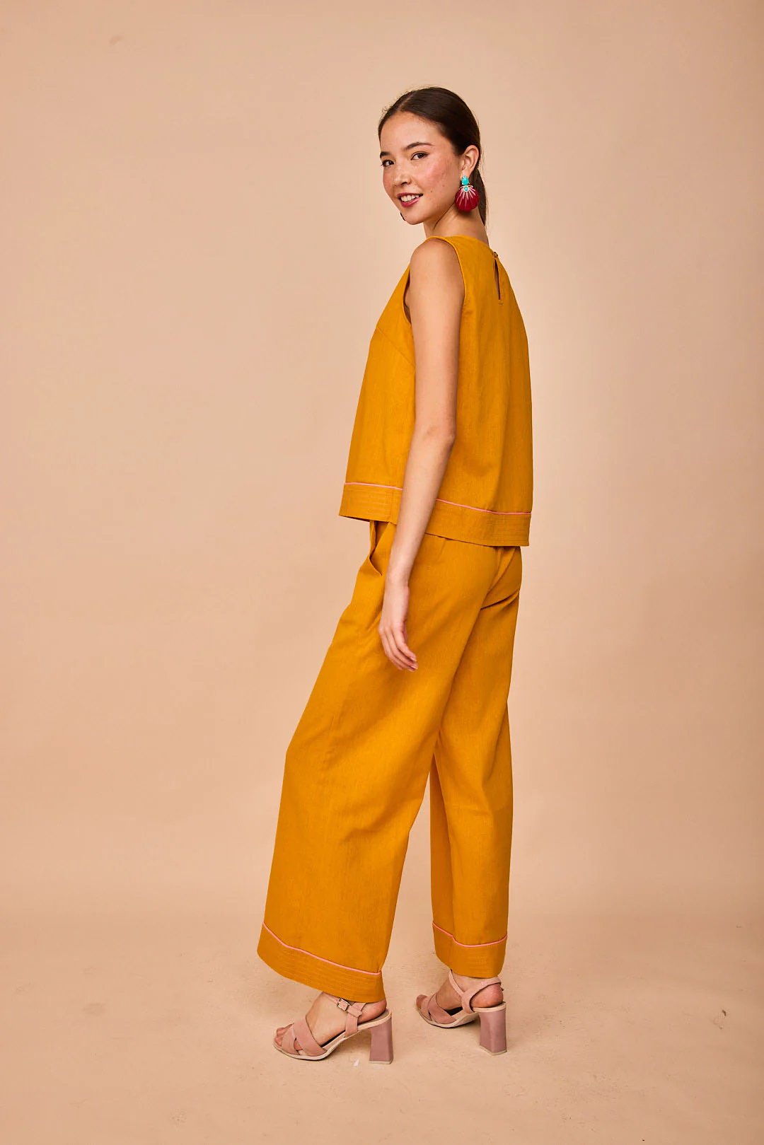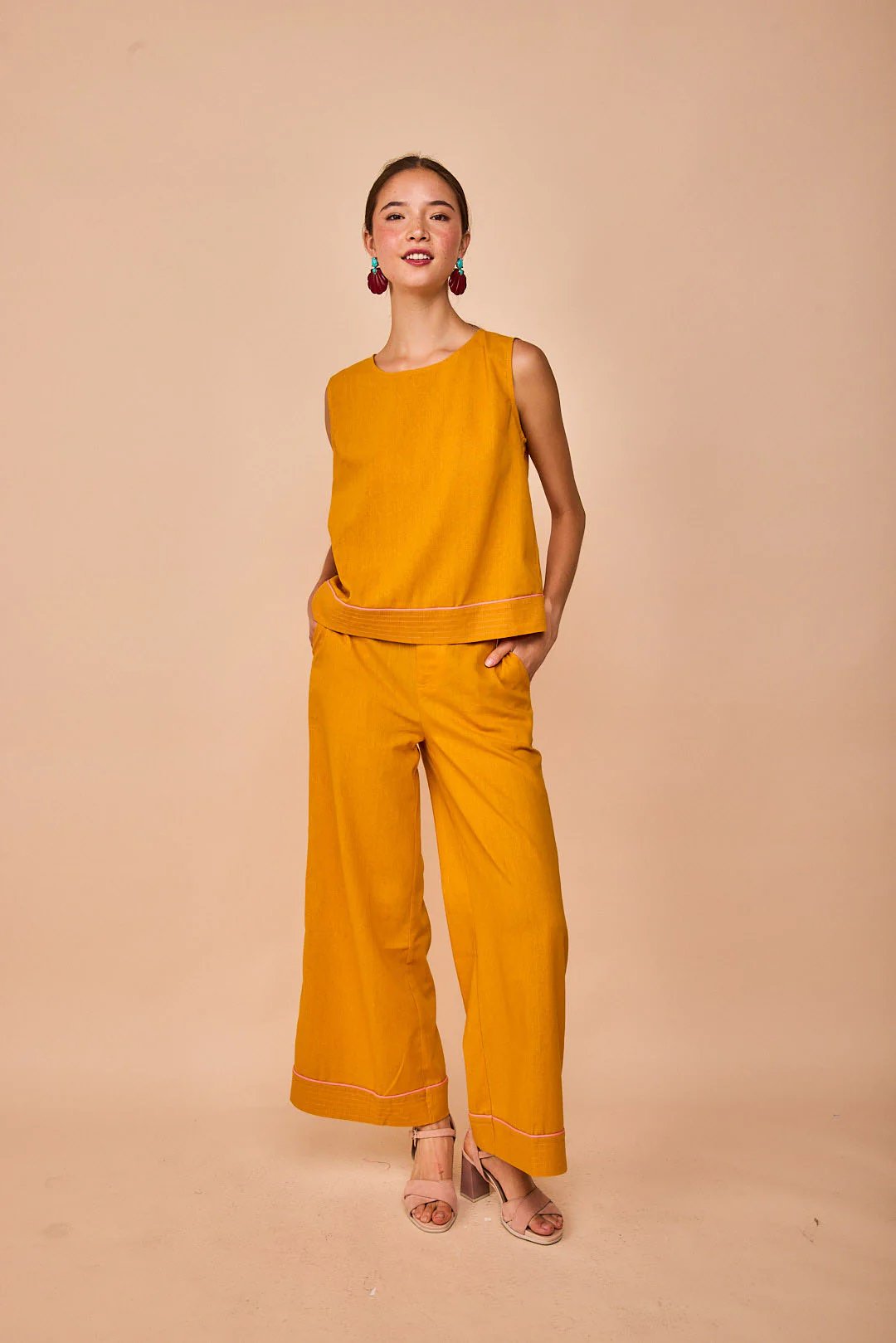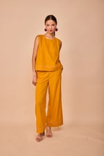 Pantalón recto con un detalle de pespunte que contrasta y le da un toque. Completa tu look con el top Elantxobe el twin set es una monada!!