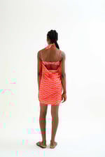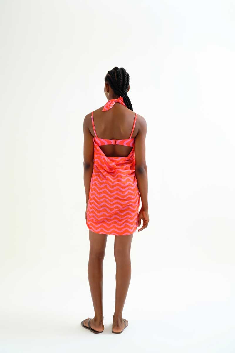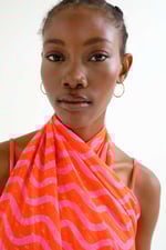 Pareo de tejido 100% algodón con estampado ondas rosa y rojo. Opción multiposición para llevar en la cintura, como vestido o como top.