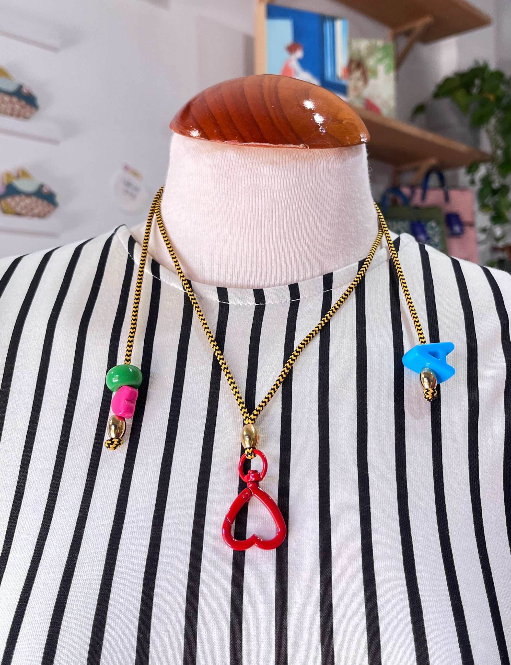 Este collar regulable de largo con mosquetón corazonado tan colorido y bonito te sirve para llevar colgado al cuello llaves, móvil, el amor y lo que necesites. Es muy fácil de regular la altura del collar y cuelga amor.