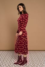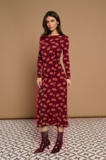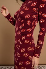Vestido midi con cuello redondo y manga larga. Tejido elástico. Estampado de labios. Fruncidos en laterales.