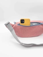 La nueva riñonera Sant Jordi con fondo color melocotón, cinta gris claro y cremallera azul empolvado. Ilustrada por Laura de Ypamiqué desde su estudio en la sierra de Huelva.