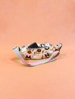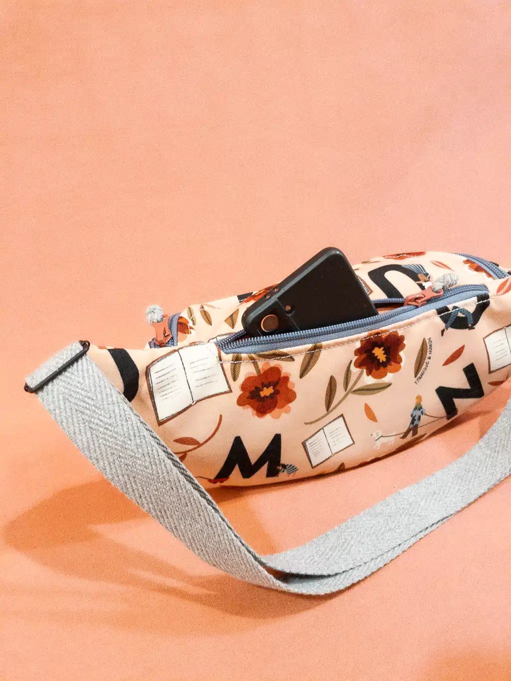 La nueva riñonera Sant Jordi con fondo color melocotón, cinta gris claro y cremallera azul empolvado. Ilustrada por Laura de Ypamiqué desde su estudio en la sierra de Huelva.