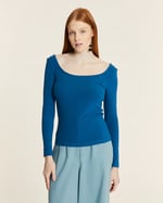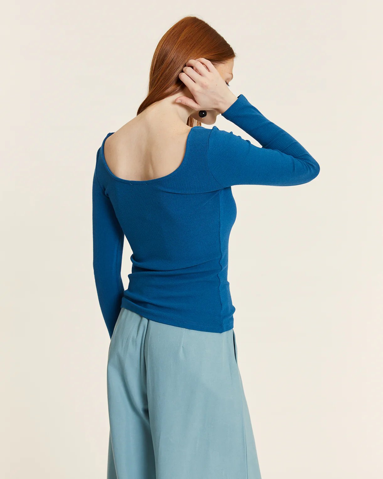 Top bailarina canalé azul, mangas rectas, cuello scoop, a la altura de la cadera.