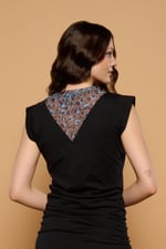 Camiseta de cuello redondo y manga sisa con volante. Escote en tul transparente animal print en V. Detalle de tachuelas. Tejido 100% algodón.